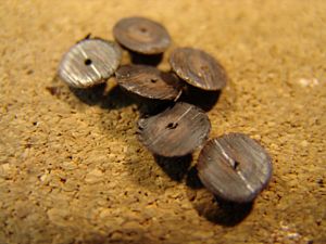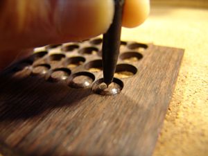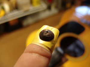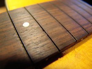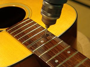 - 3.フレット交換の前にフィンガーボードにあけた穴を元に戻しましょう。穴径にあうようにエボニー片を丸く削ります。