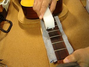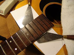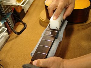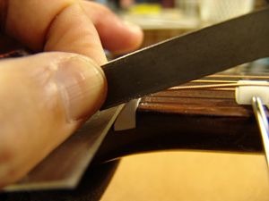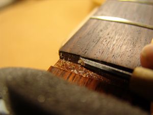 - 9.フレット溝の中のゴミ類を削り出します。このときもフレット溝エッジを傷つけないように注意します。