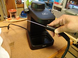 - 11. 蒸気発生用のエスプレッソメーカーにホースと蒸気注入ジグを取り付けます。