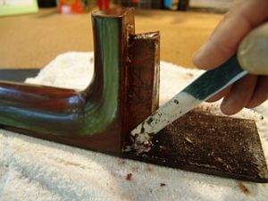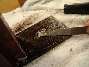 - 14.蒸気の熱と湿り気が残っている間に古い接着剤(ニカワ)を削り落としておきます。