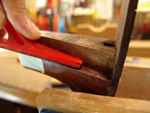 - 20.ネック接合部を削っていきます。フィンガーボード側(右)は削らず、ヒール部(左)だけに傾斜を持たせるように加工していきます。