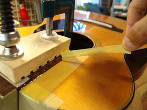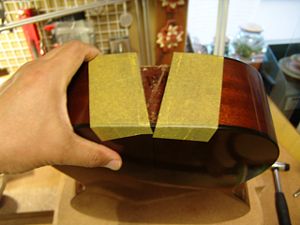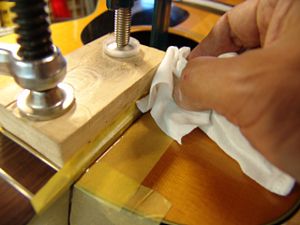 - 36.0.クランプと当て木でネックを固定し、あふれ出た接着剤をふき取っていきます。