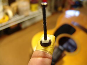 - 16.1弦のプレート凹み部分にプラグを接着しました。小ネジは少し引き上げてプラグを固定した後、緩めとります。