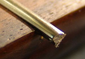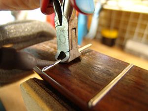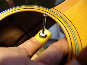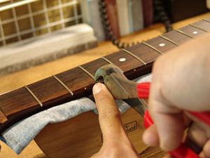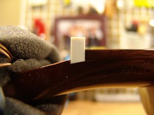 - 4.ドリル穴にエボニー材を押し込み、フィンガーボードを傷つけないように出た部分をカットします。