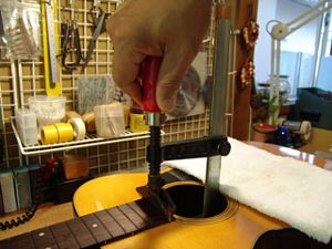 - 22.ストリングリフターで弦を待避させて、ナット溝を徐々に下げていきます。