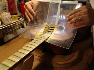 - 33.引き続いてフレットすりあわせを行いましょう。マスキングテープでフィンガーボードを保護します。