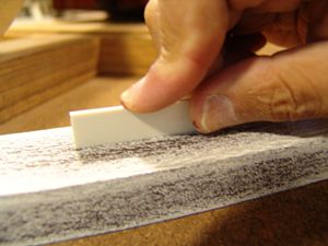 - 26.ネックをボディに密着させながらサンドペーパーを抜き取ります。
