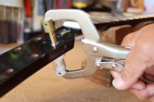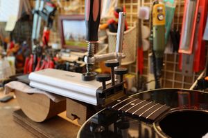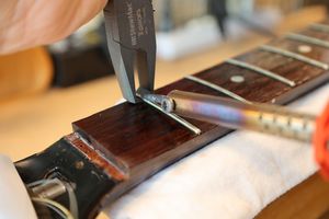 - 21.弦を張って弦高調整を行います。2フレットを指で押さえて1フレットと弦の隙間がギリギリに下がるまでナット高を下げます。