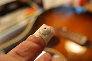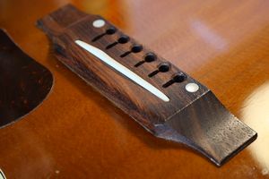 - 1.ボディ内部ブリッジの裏側に取り付けられているブリッジプレートです。弦のエンドポールが食い込んでしまう状態になっています。