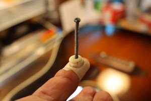 - 16.1弦のプレート凹み部分にプラグを接着しました。小ネジは少し引き上げてプラグを固定した後、緩めとります。