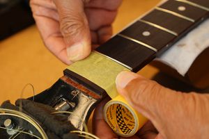 - 29.引き続いてフレットすりあわせを行いましょう。マスキングテープでフィンガーボードを保護します。