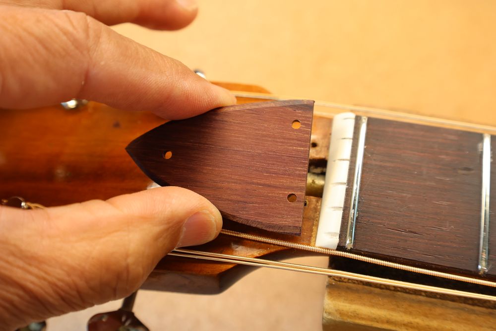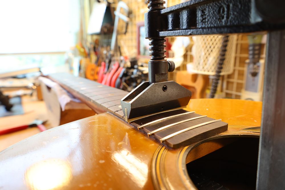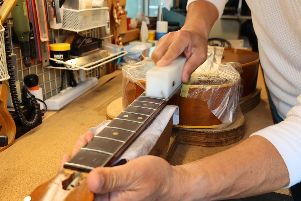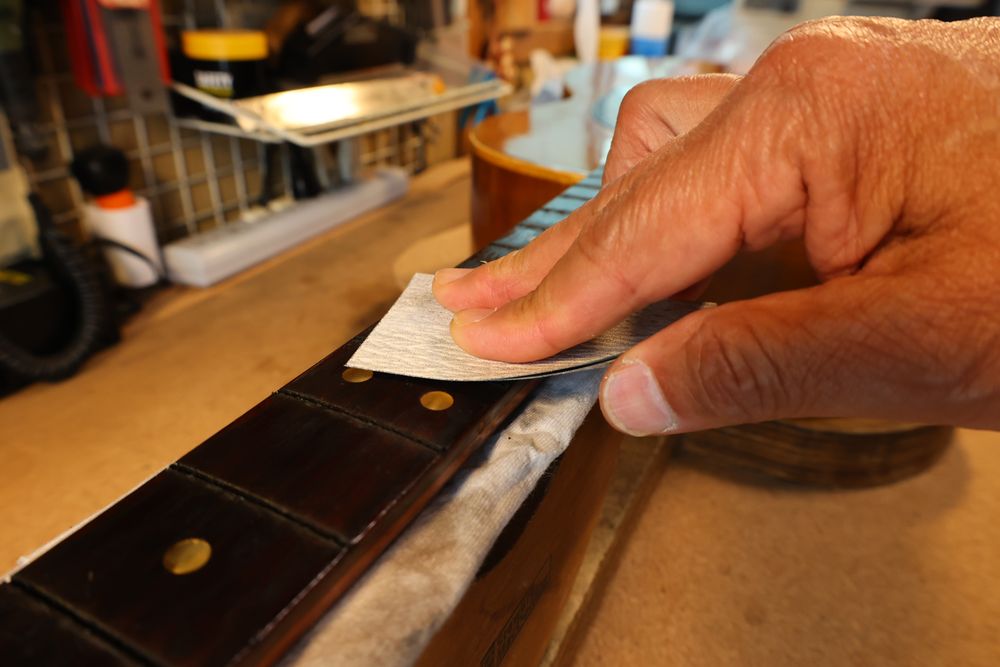 - 12.目視および指で触ってネック、フィンガーボードと段差のないことを確認しておきます。