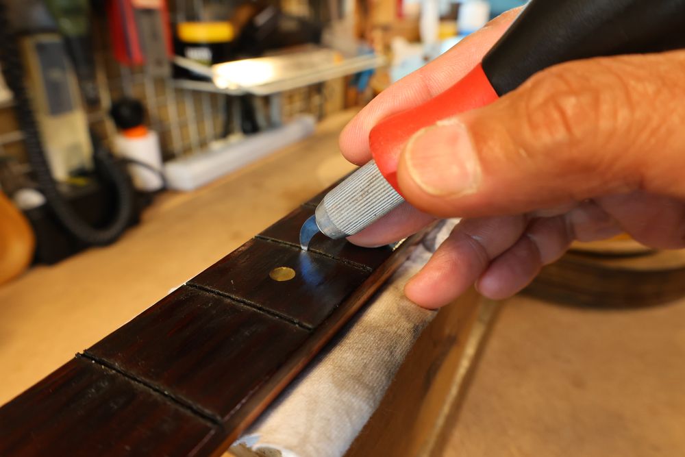 - 5.フレット溝の中のゴミ類を削り出します。このときもフレット溝エッジを傷つけないように注意します。