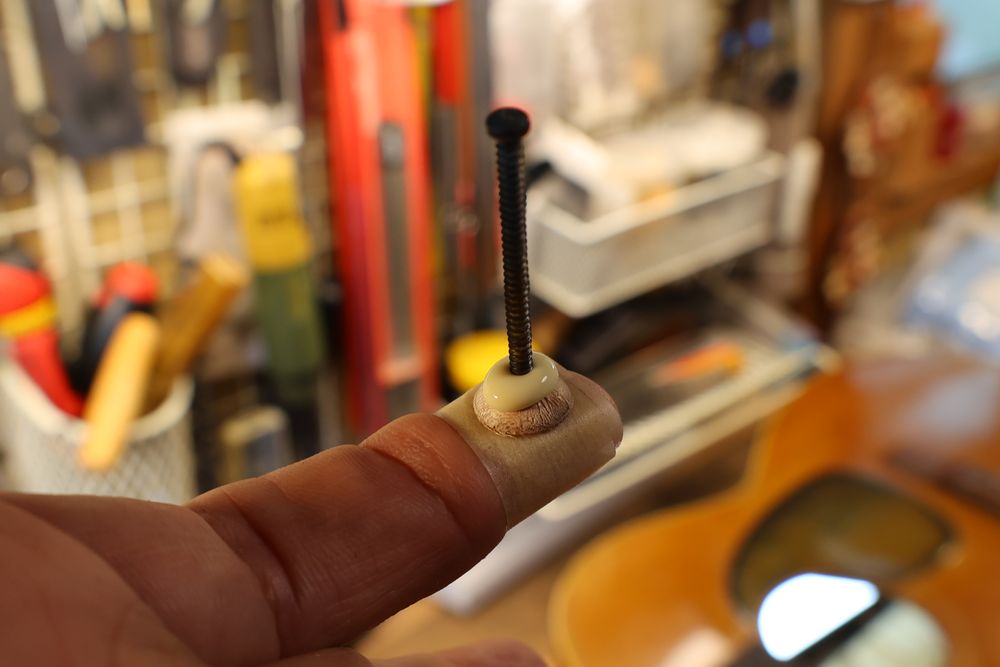 - 14.タイトボンドをプラグにつけて、小ネジを中央の穴にねじ込みます(この小ネジも半固定状態です)。