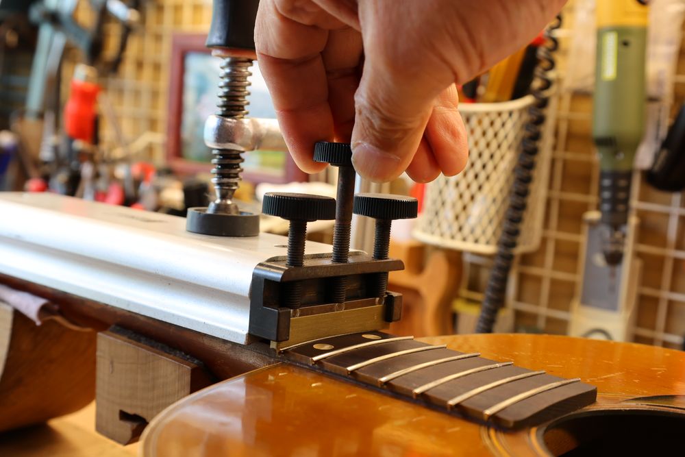 - 22.ストリングリフターで弦を待避させて、ナット溝を徐々に下げていきます。