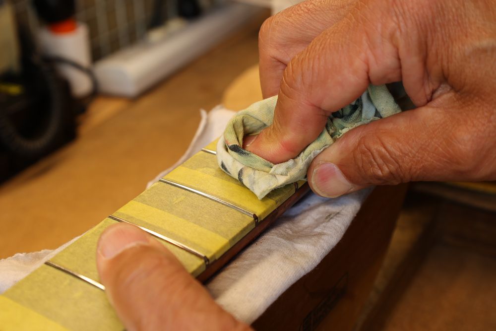 - 29.引き続いてフレットすりあわせを行いましょう。マスキングテープでフィンガーボードを保護します。