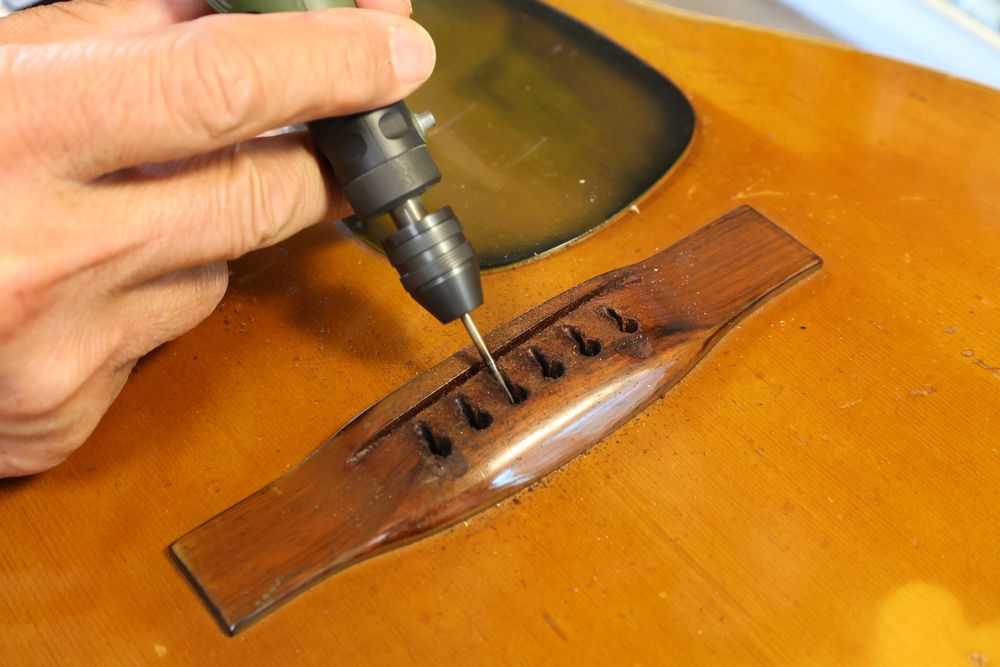 - 11.さらにミニルーターで弦の導出角度をつけていきます。