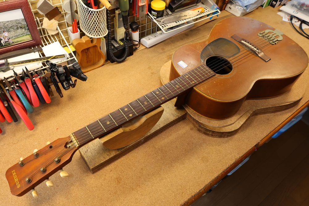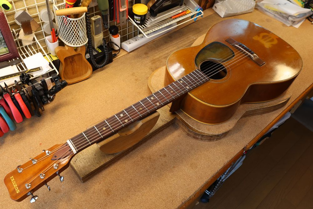 戻る和歌山県にお住まいのT.M.さんから木曽鈴木 F-18のリペアご依頼をいただき、ブリッジ脱着、フレット交換、ブリッジプレート・リペアなどを含むトータルリペアを行いました。 T.M.さんからは以前にGibson Hummingbird、木曽鈴木 W-180のリペアご依頼をいただいており、今回で2回目、3本目のリペアご依頼となります。T.M.さん、いつもありがとうございます。 リペア後のギターを受け取られて、T.M.さんからとても暖かいメッセージが届きました。