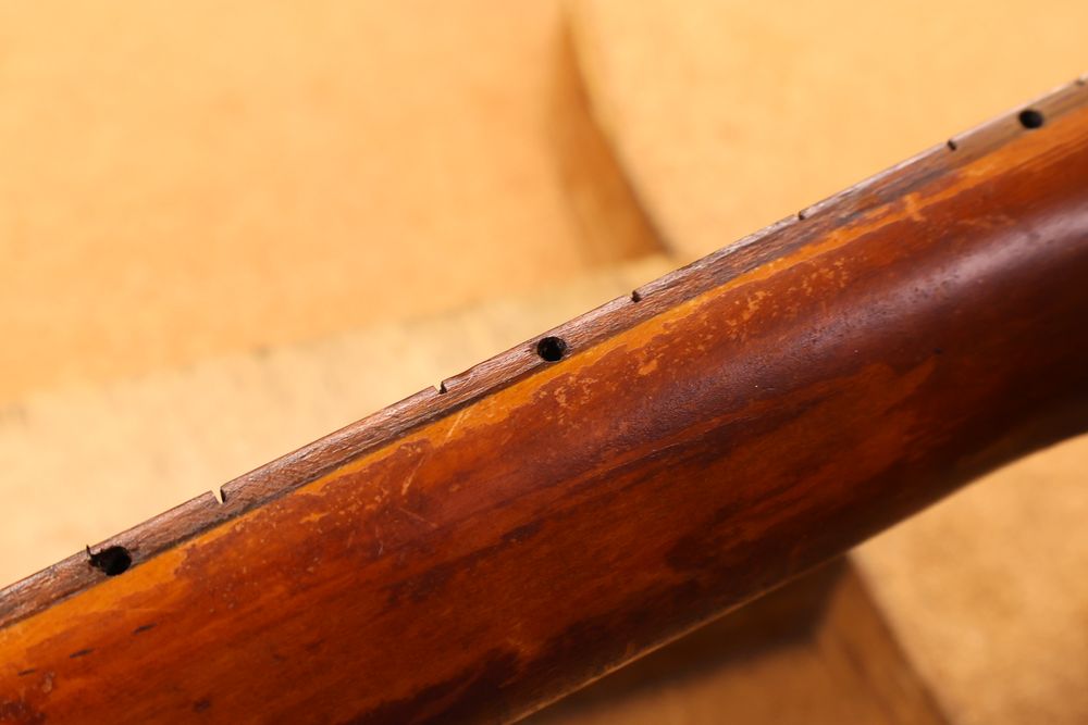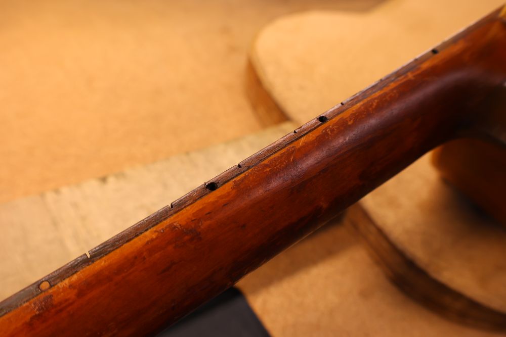 特にネック元起きが顕著で、本来であればネックリセットが必要なのですが、残念ながら対応していない個体でしたので、弦周りリペアのみで弦高をどこまで下げることができるか不安でした。