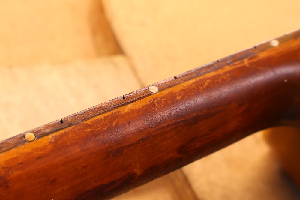 - 1.リペア前のヘッド部です。1弦ペグポールが欠損しています。