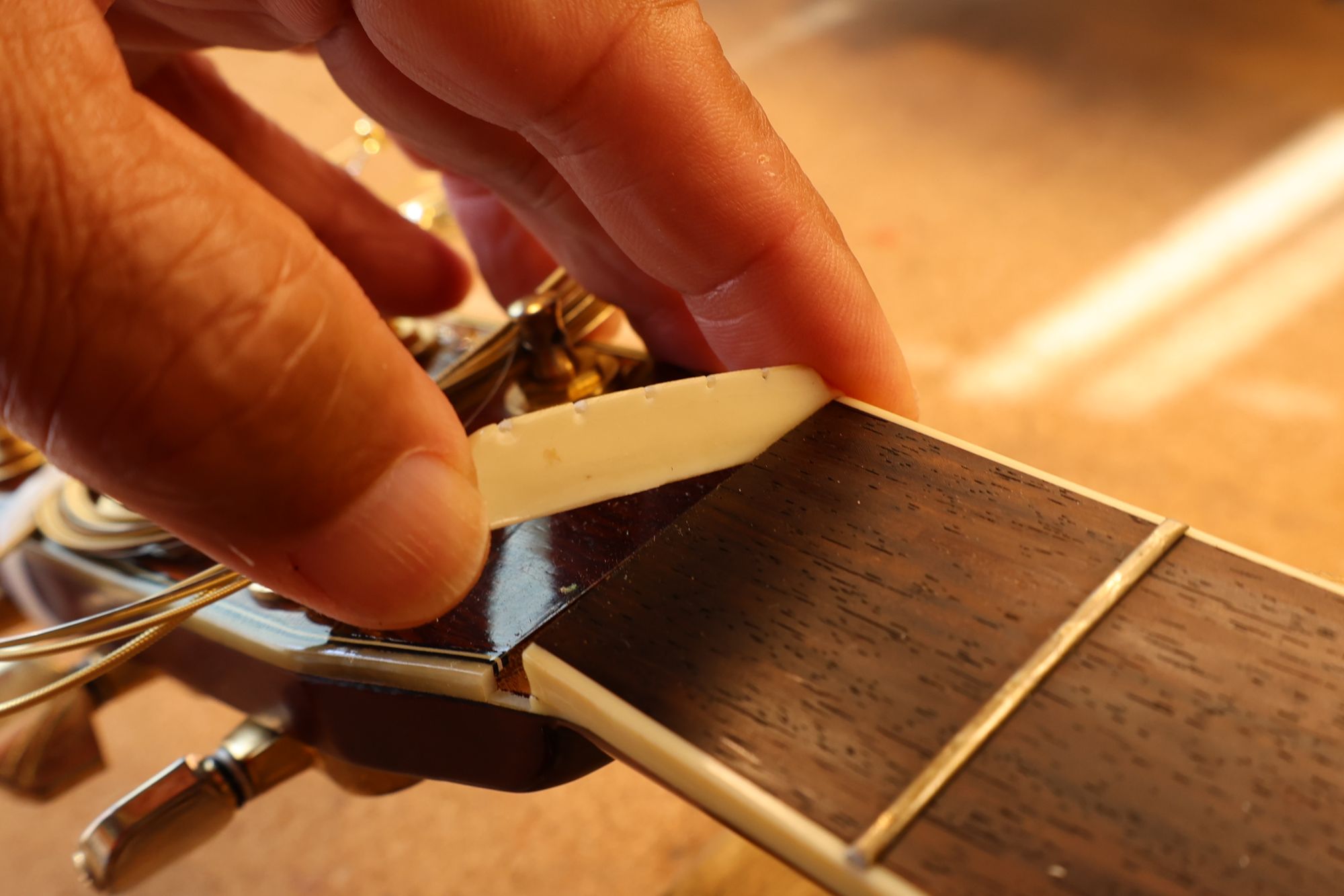 - 9.1弦側からもナットの密着を確認します。