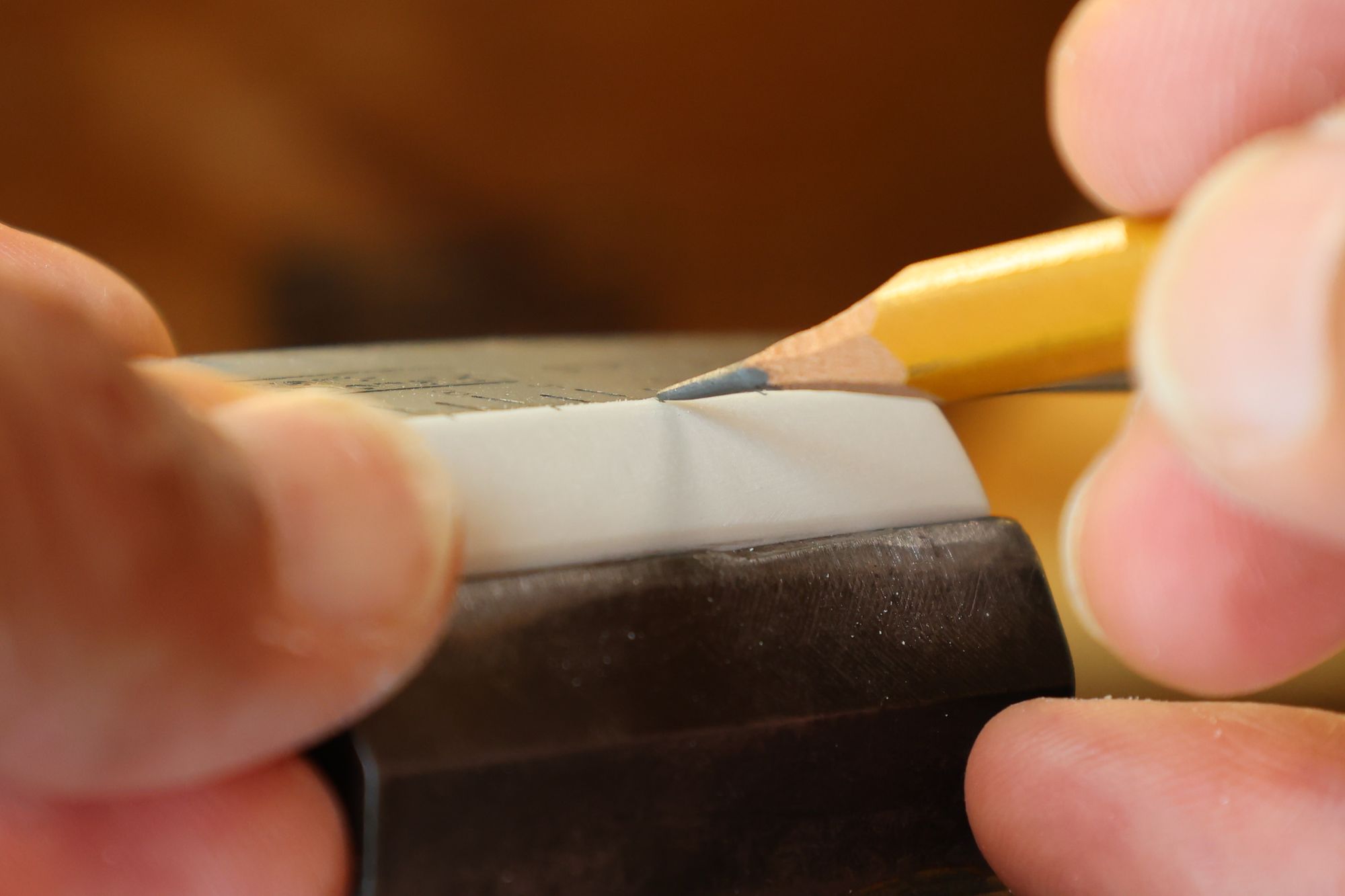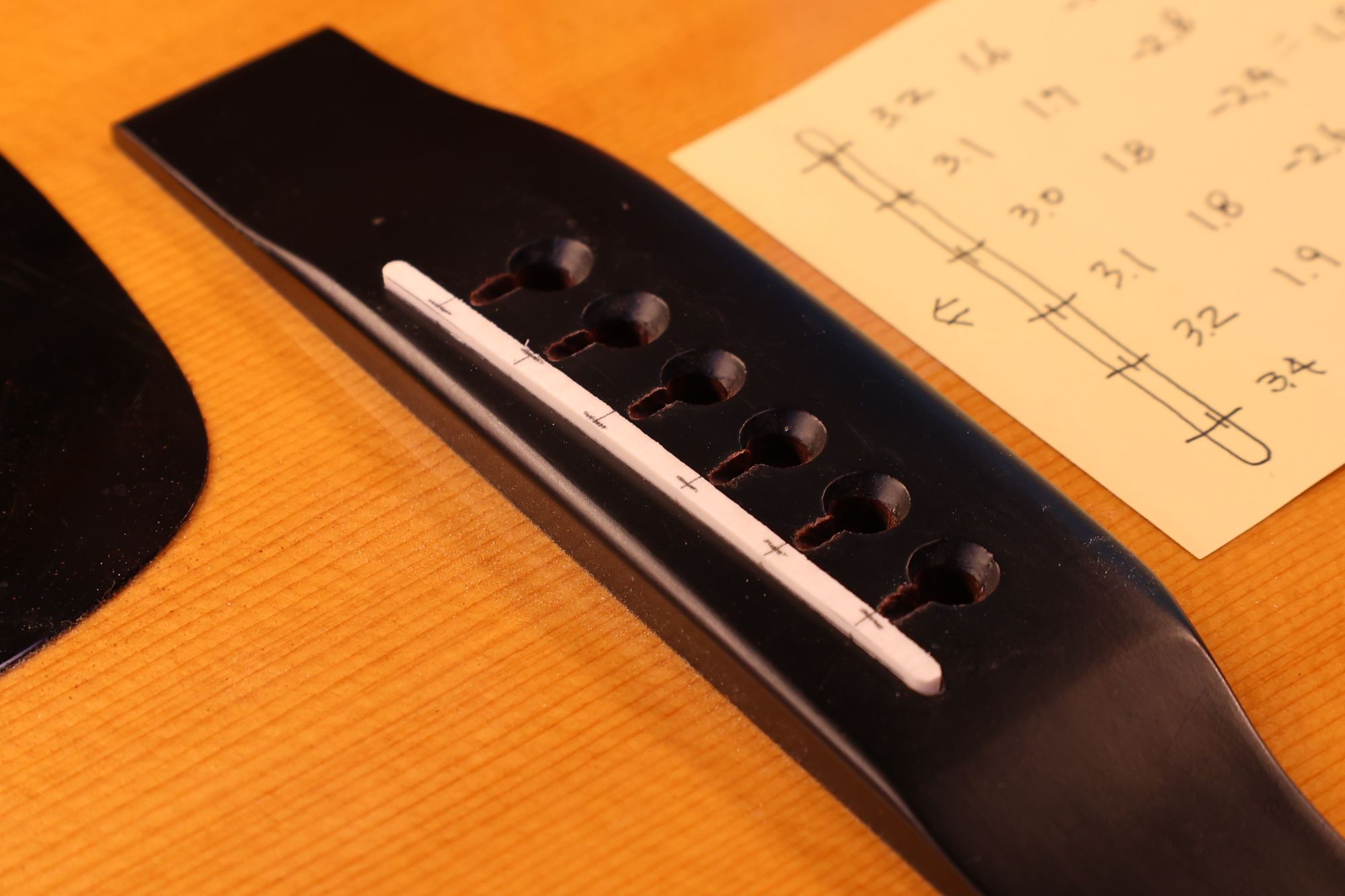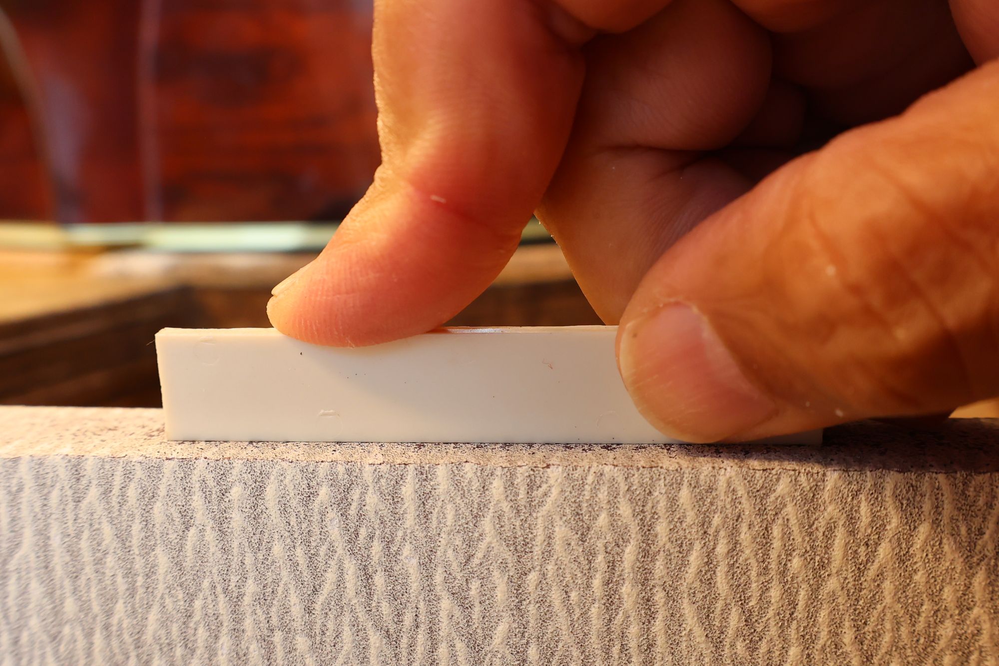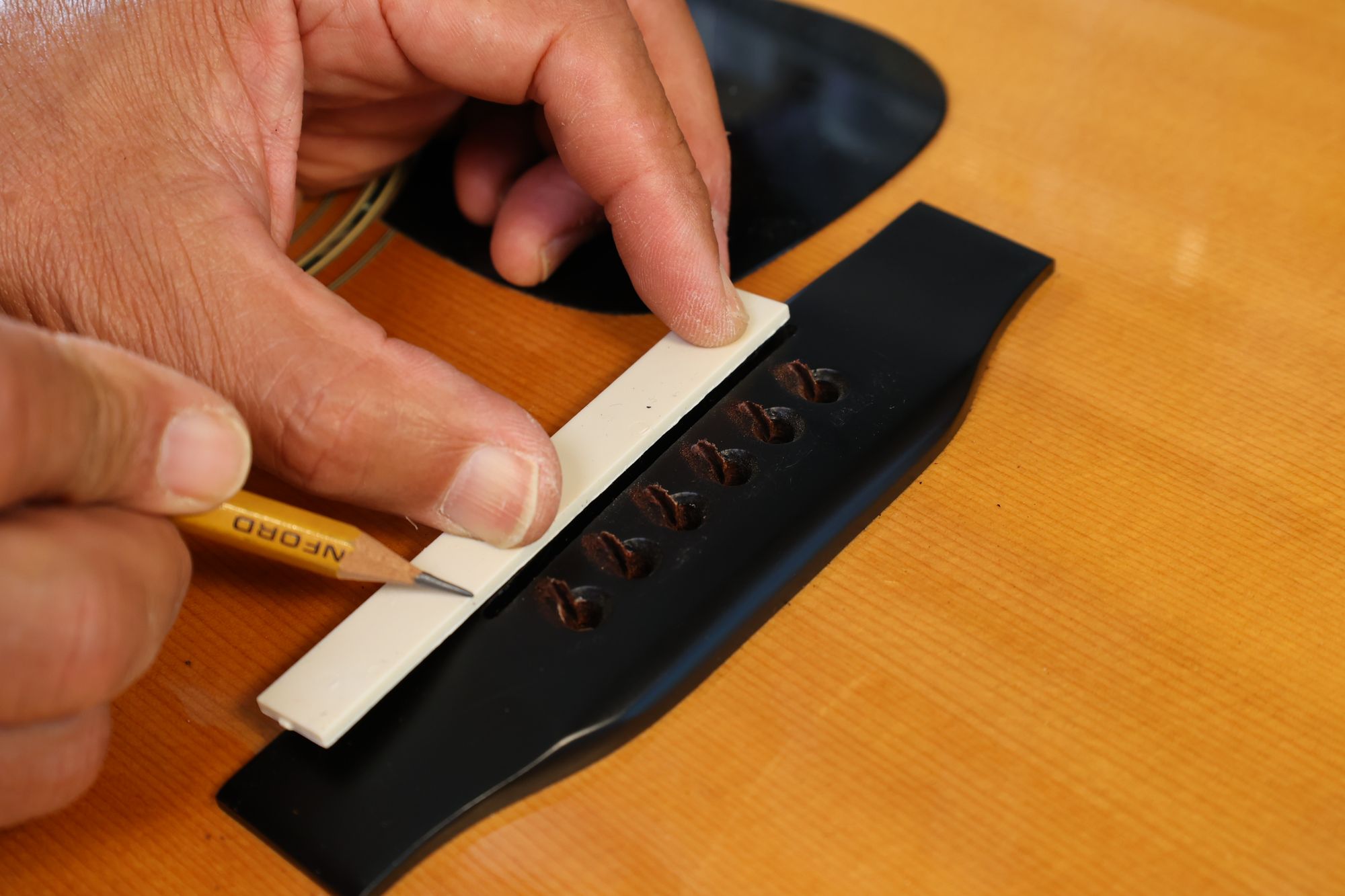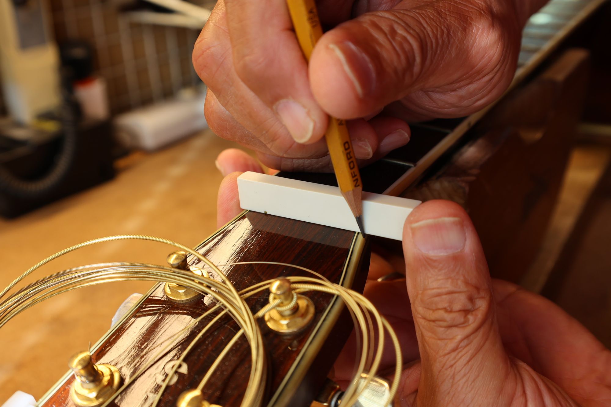 - 18.弦溝位置を新しいナットに書き込みます。