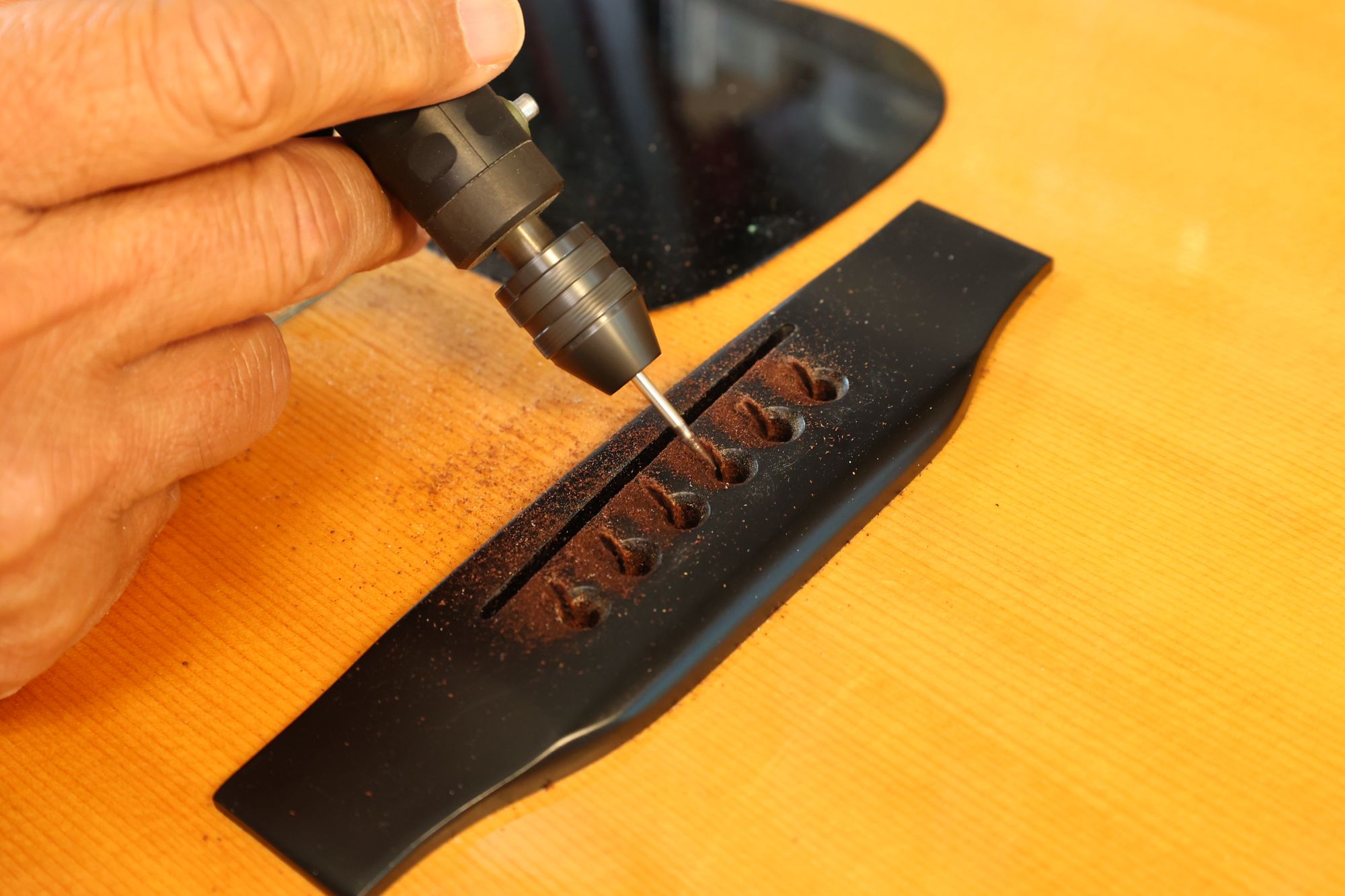 - 13.さらにミニルーターで弦の導出角度をつけていきます。