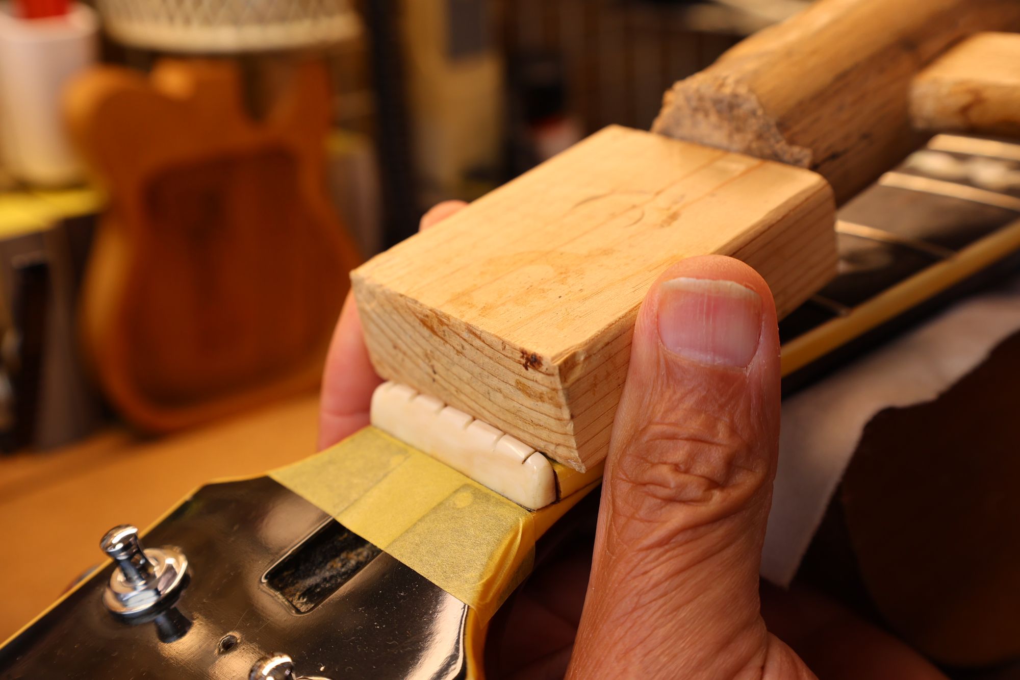 - 19.弦を張って弦高調整を行います。2フレットを指で押さえて1フレットと弦の隙間がギリギリに下がるまでナット高を下げます。
