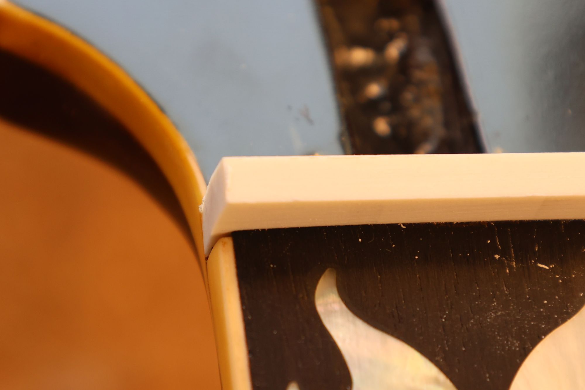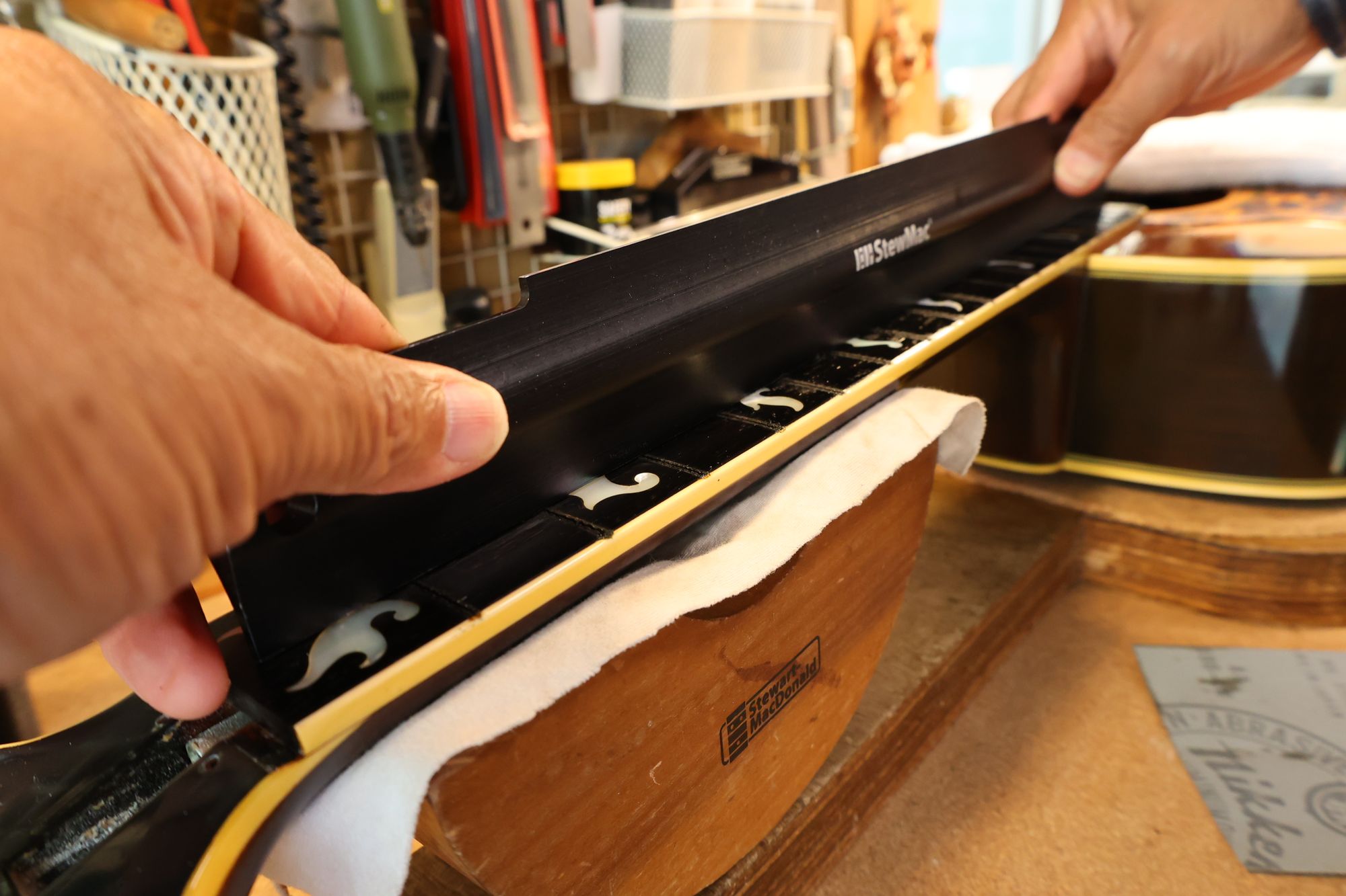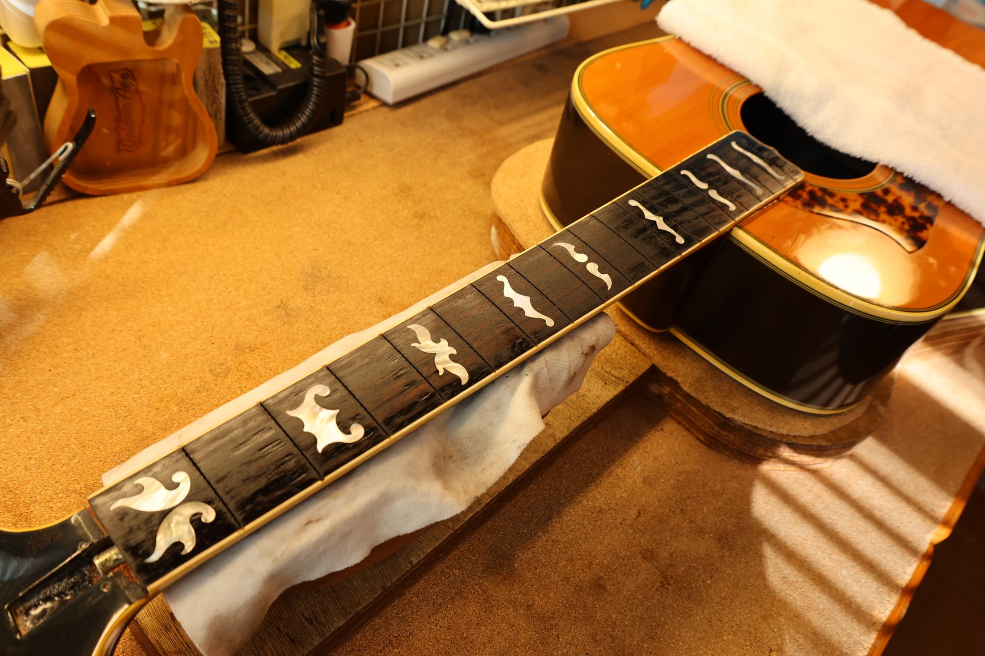 - 12.目視および指で触ってネック、フィンガーボードと段差のないことを確認しておきます。