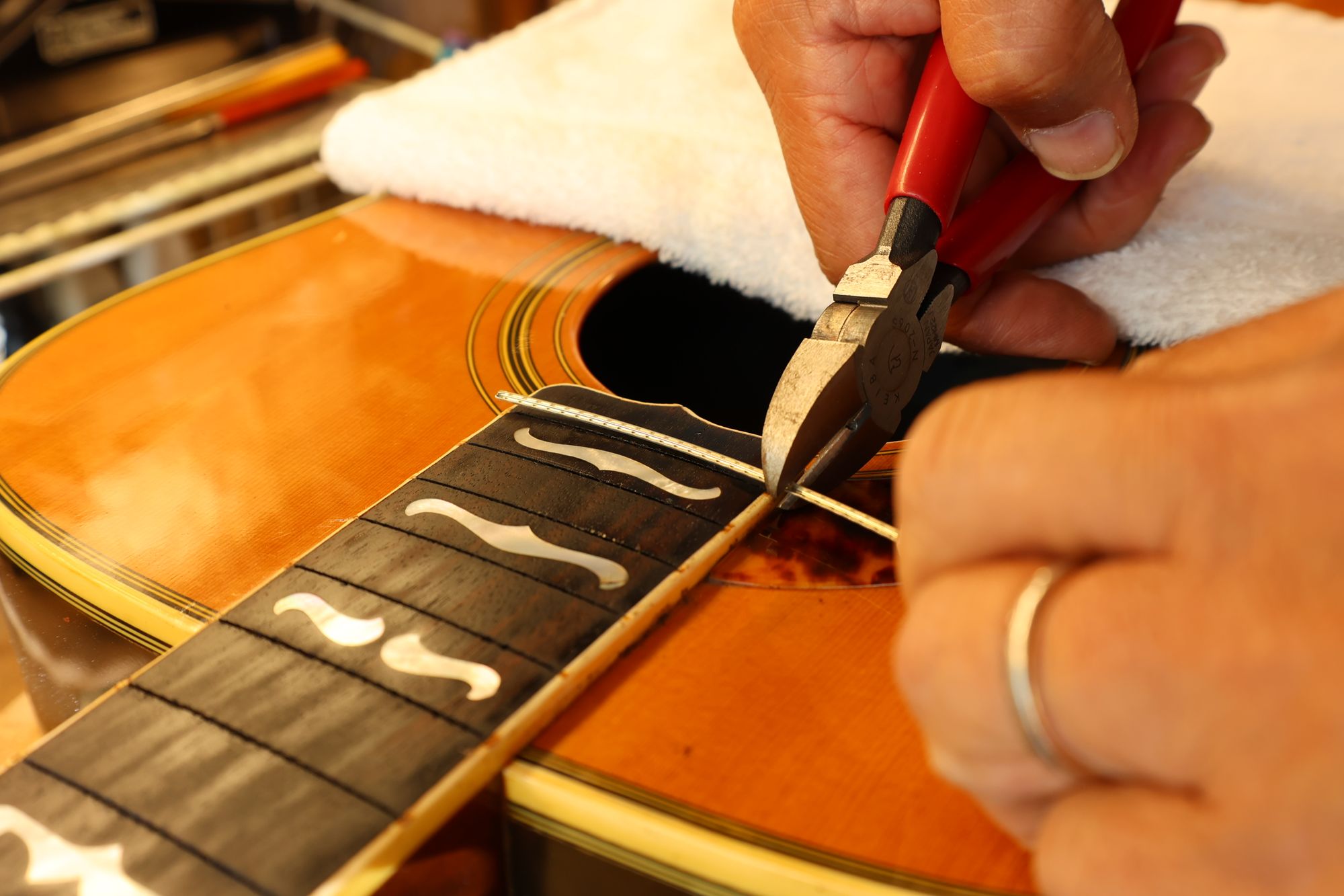 - 27.専用のヤスリを使ってフレット端を整形します。