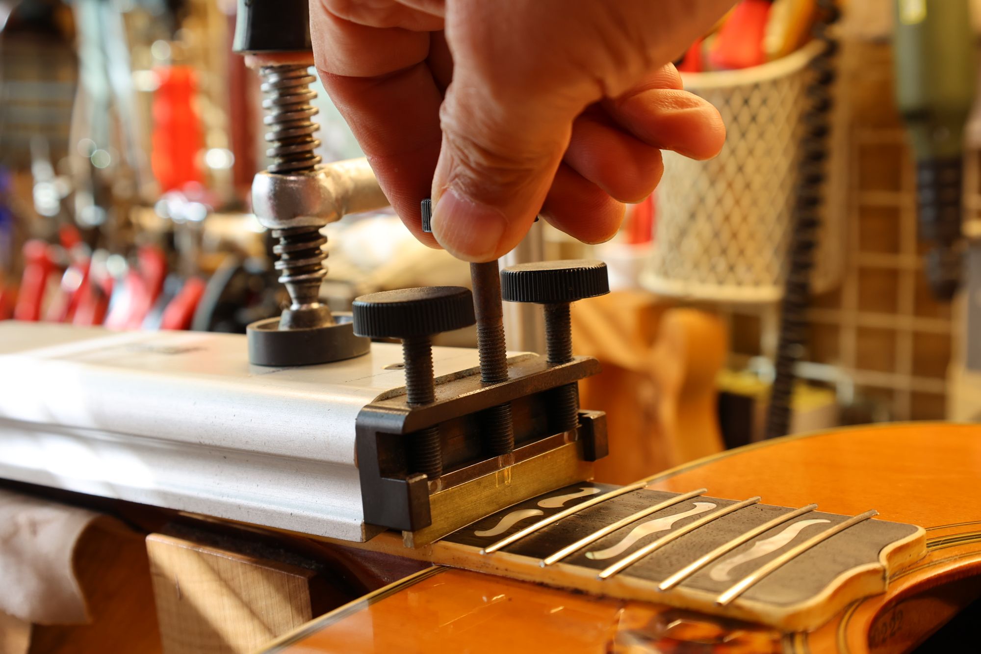 - 20.ストリングリフターで弦を待避させて、ナット溝を徐々に下げていきます。