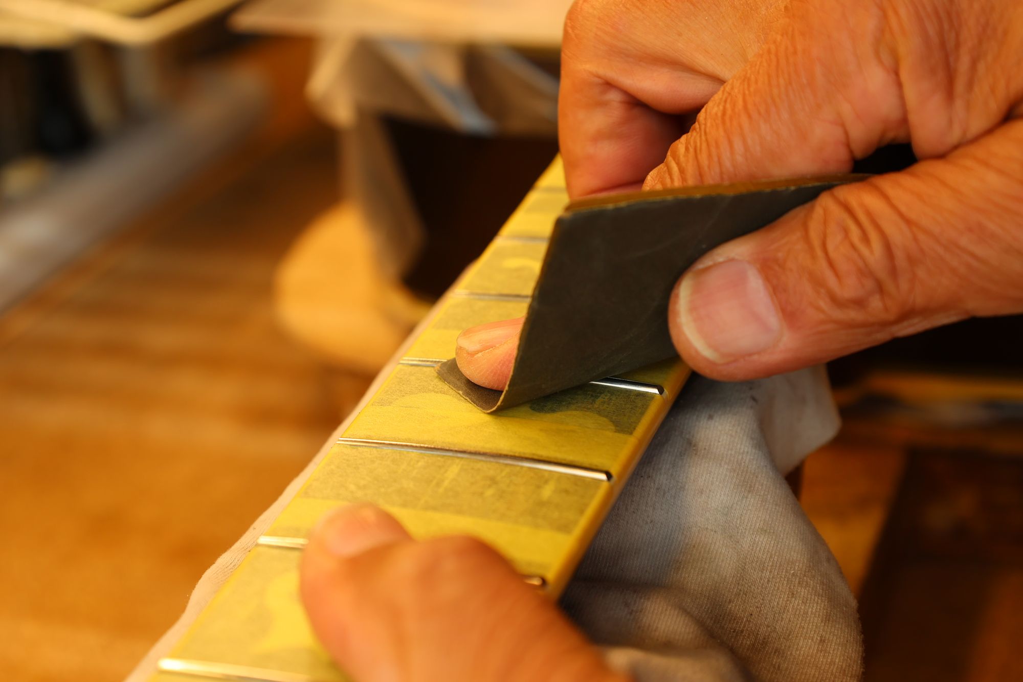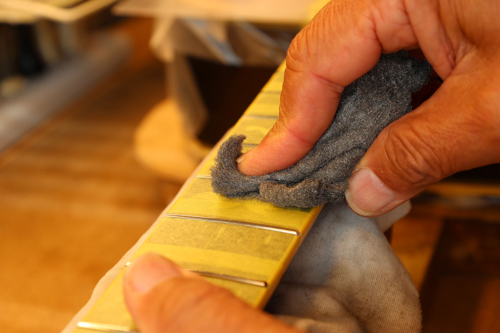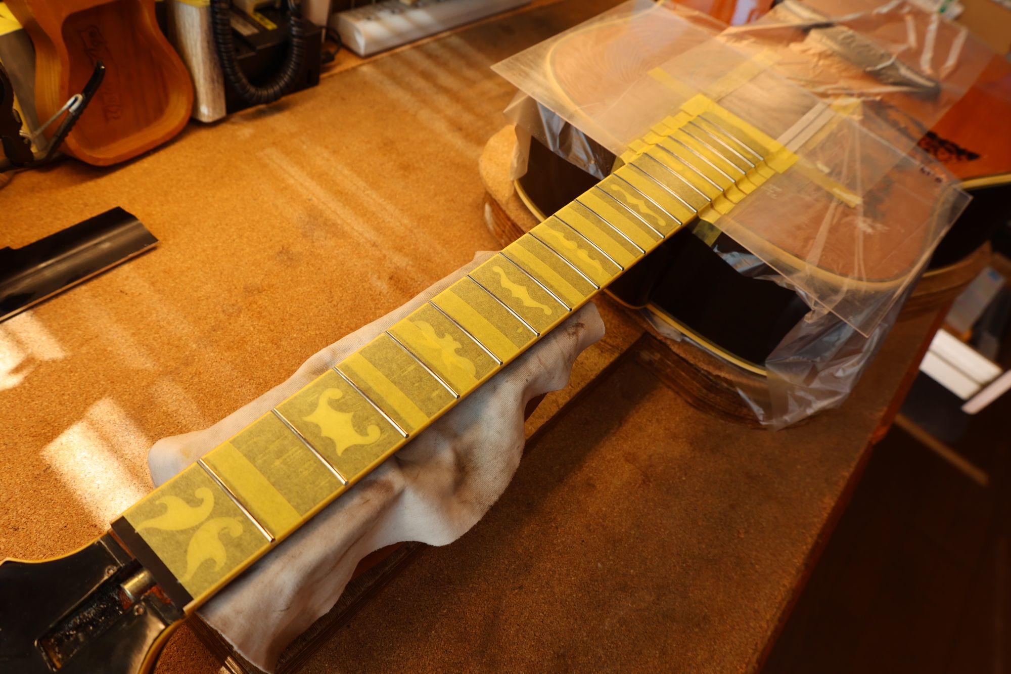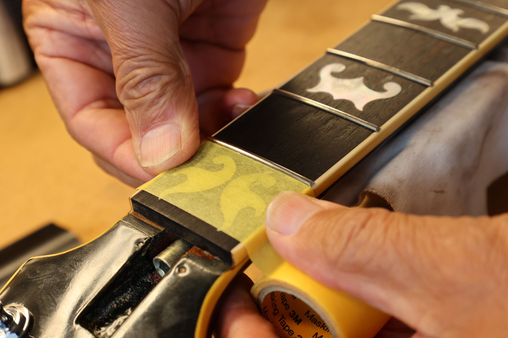 - 31.引き続いてフレットすりあわせを行いましょう。マスキングテープでフィンガーボードを保護します。
