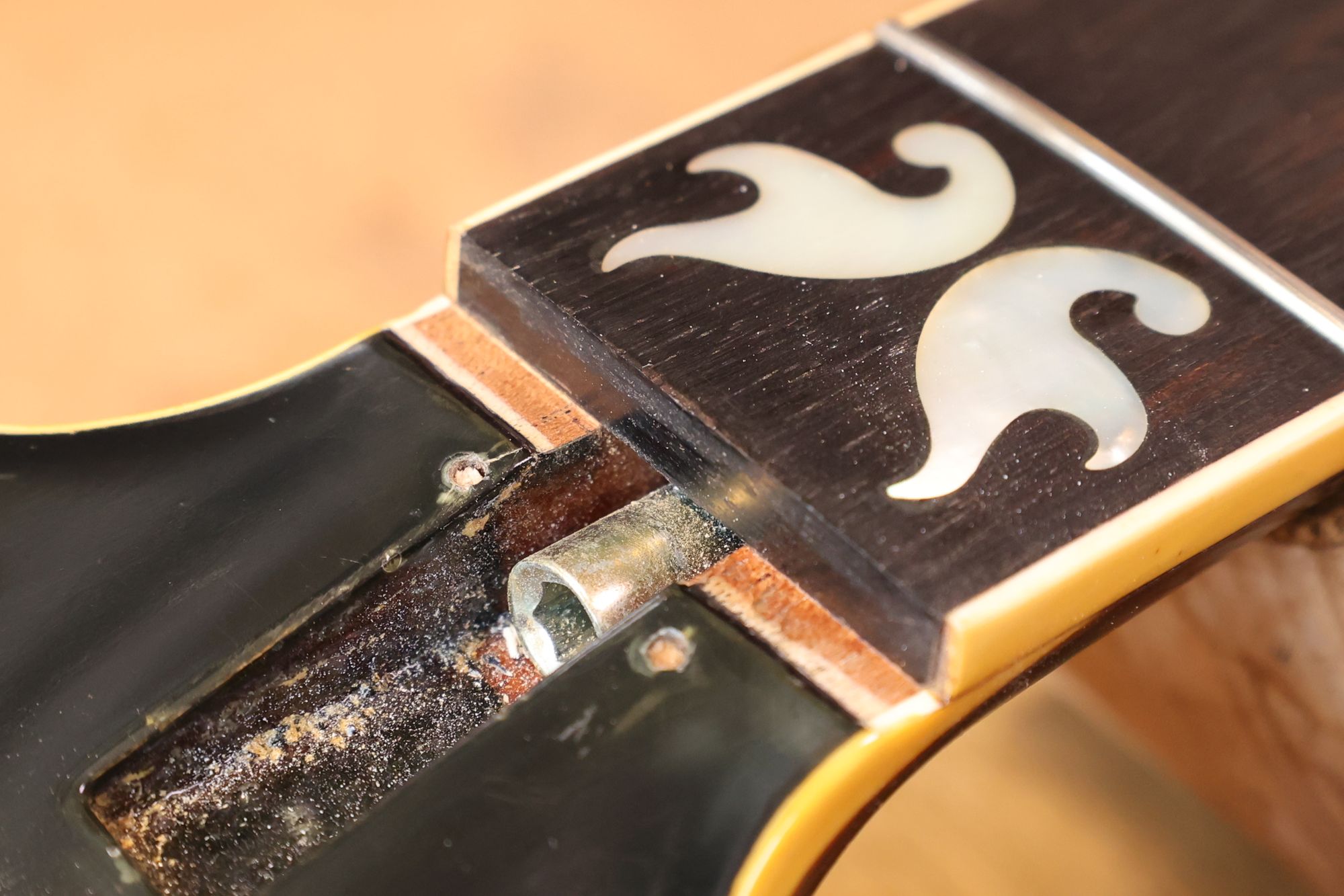 - 5.クリーニング完了したナット溝です。ナットが溝と直接触れることによってギターの音色の改善が期待できます。