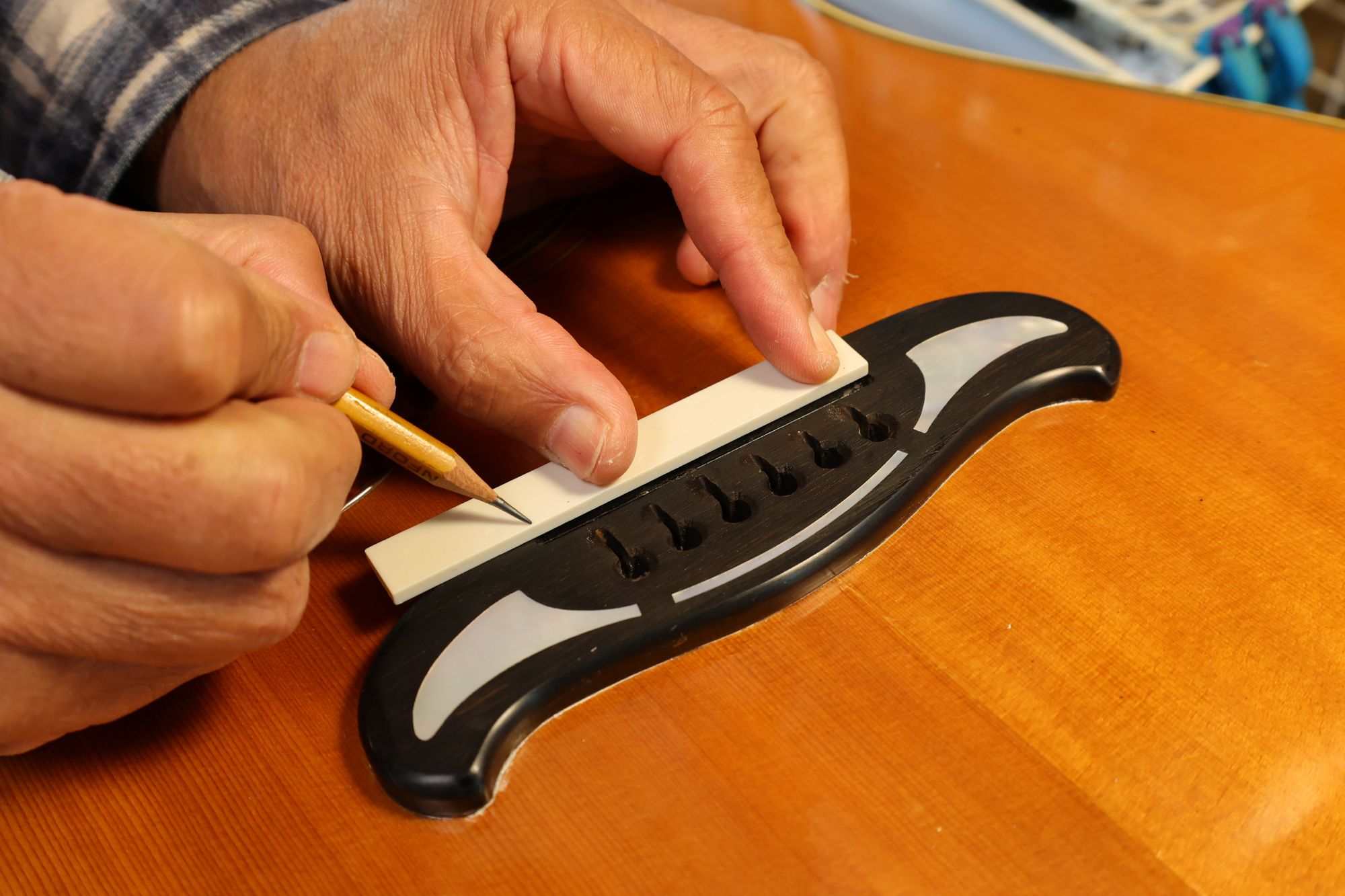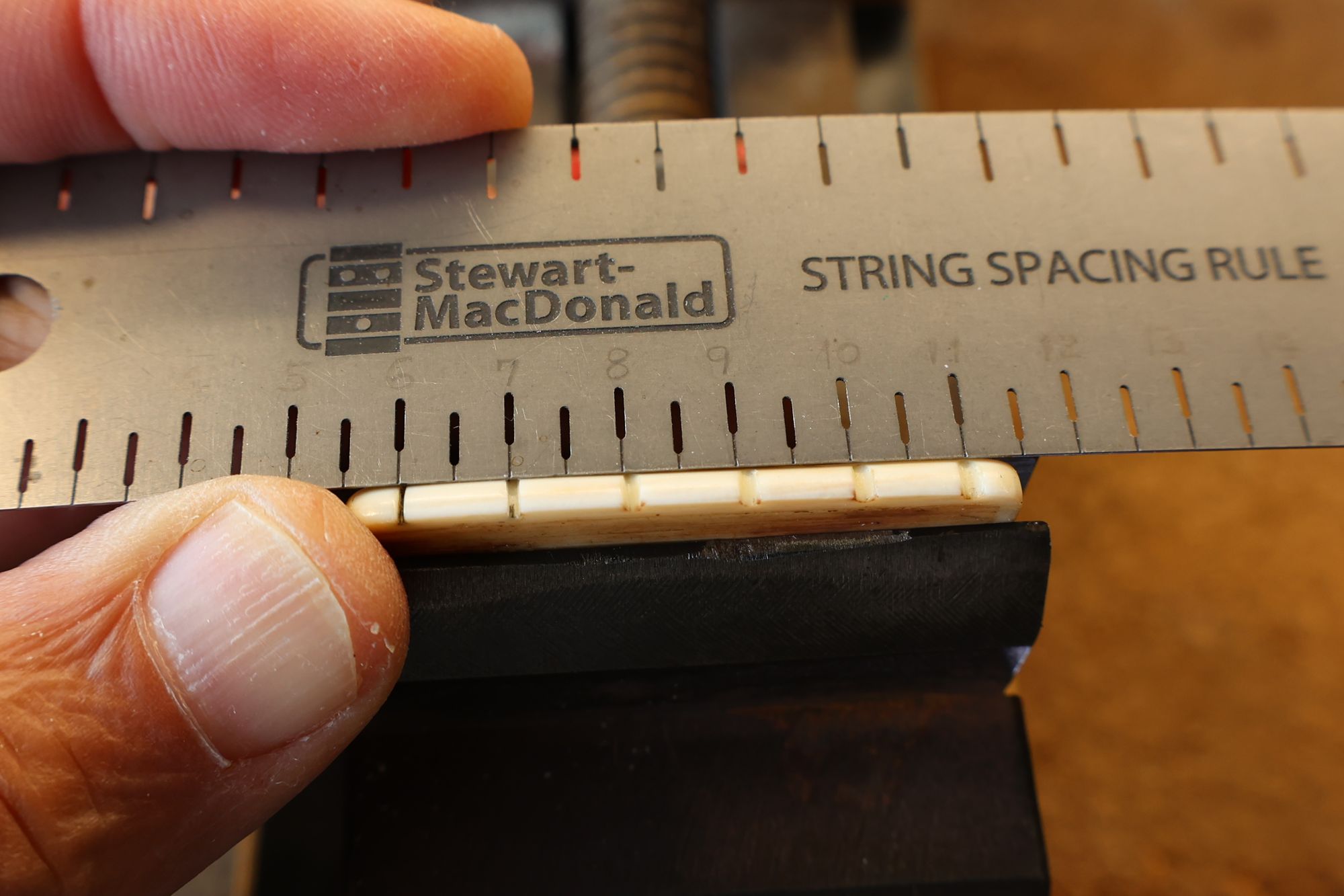 - 16.弦溝位置を新しいナットに書き込みます。