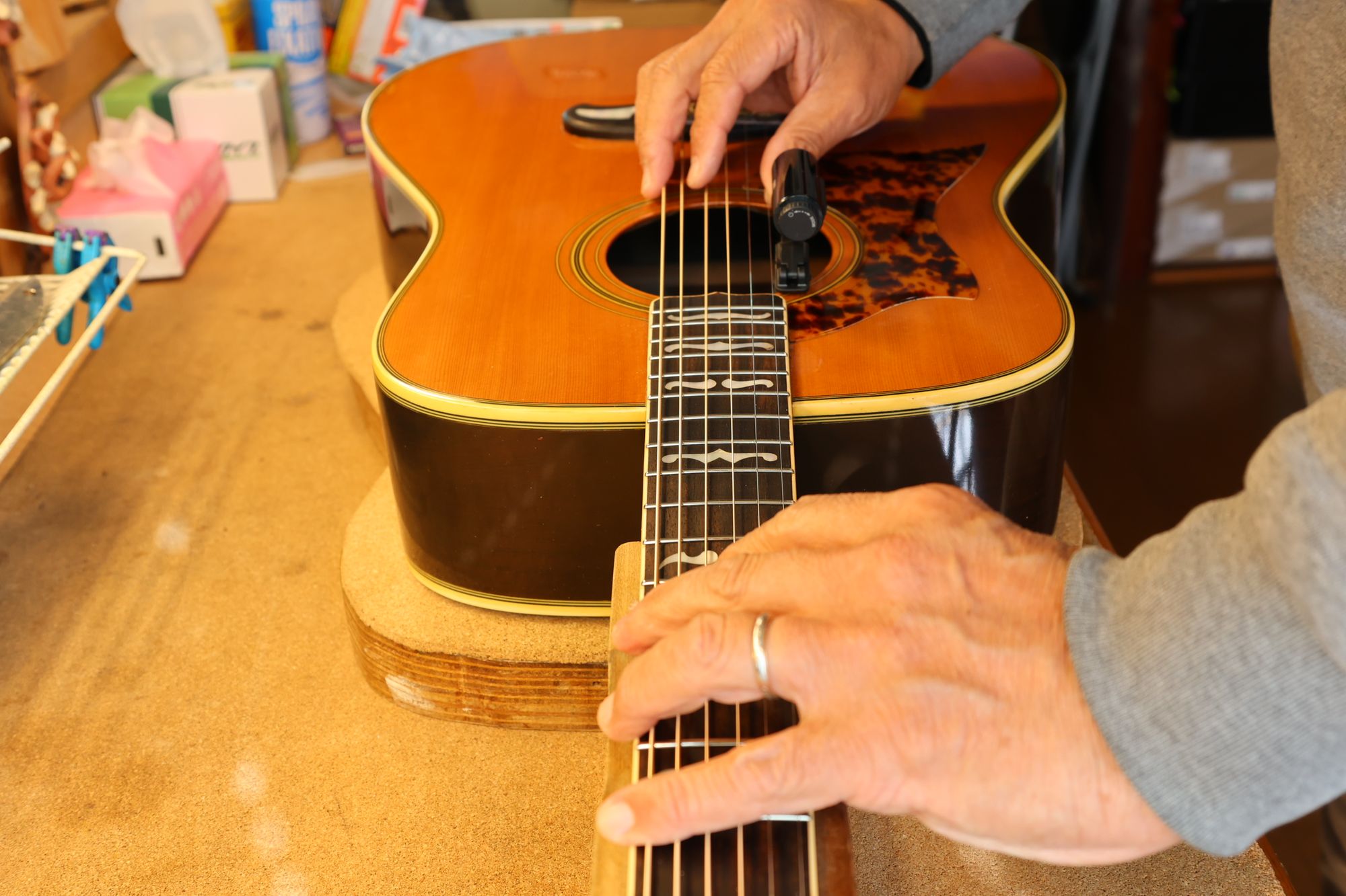 - 1.サウンドホールにチューナー、サドル位置にイントネーターを取り付けました。
