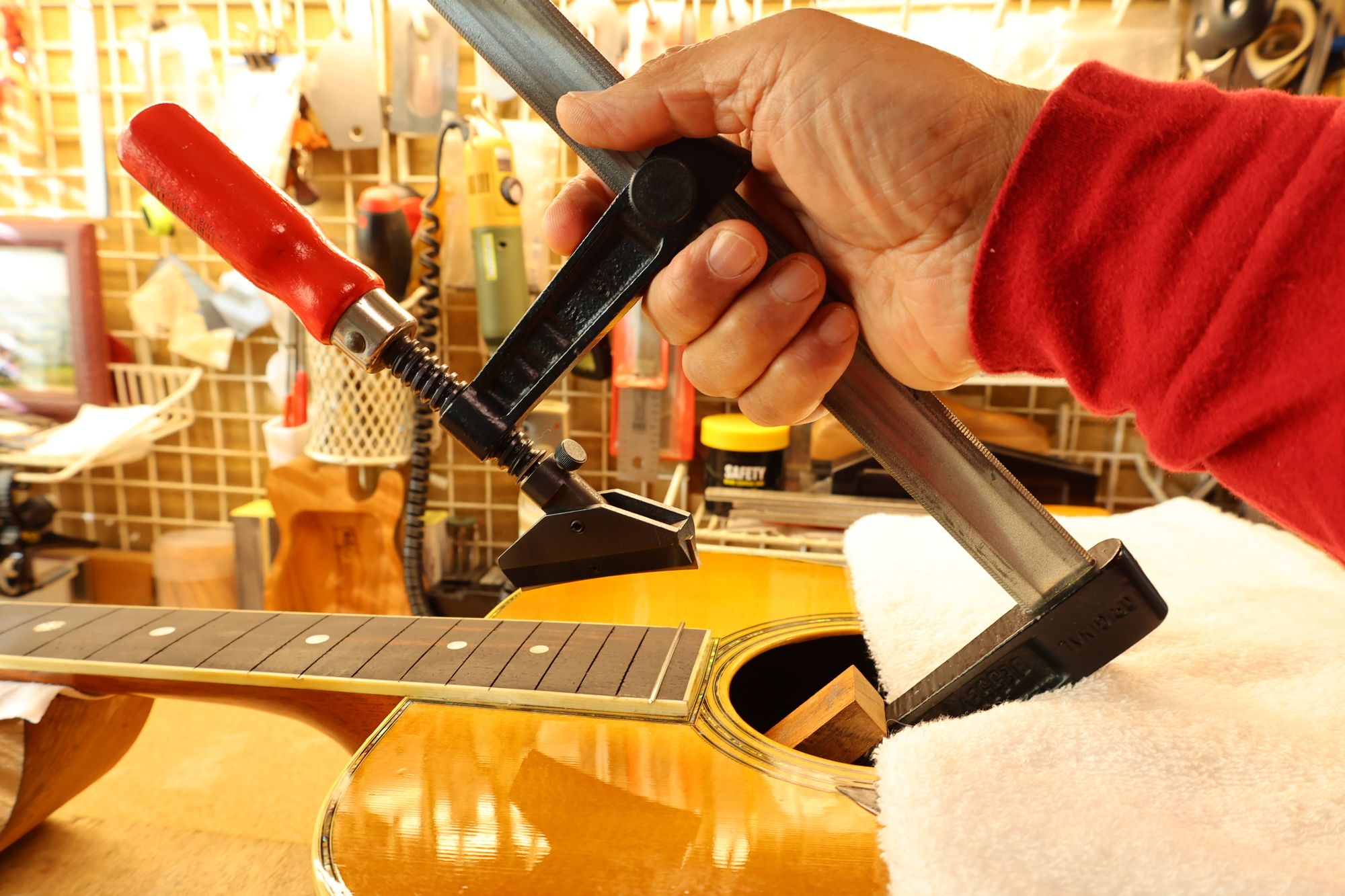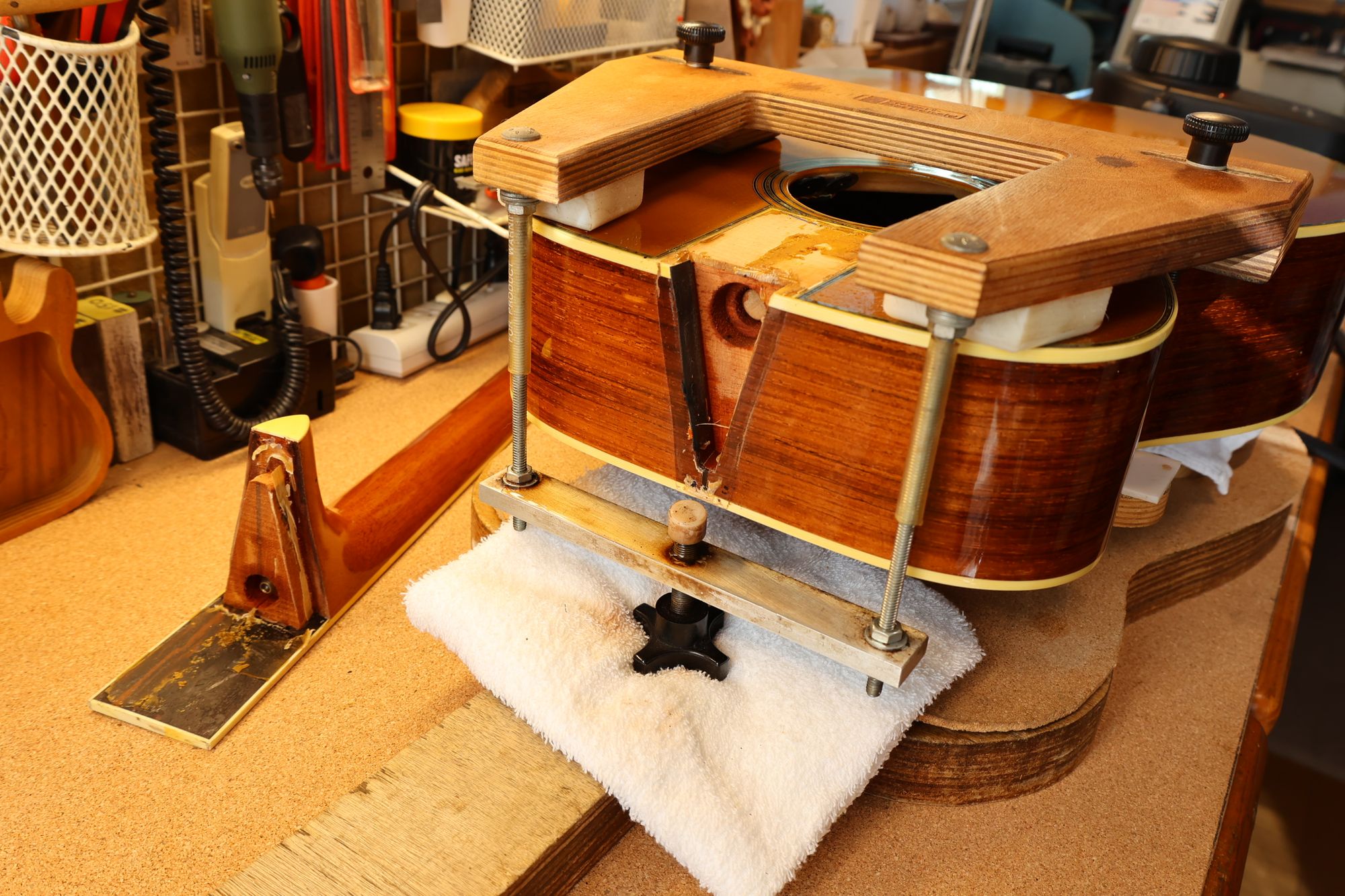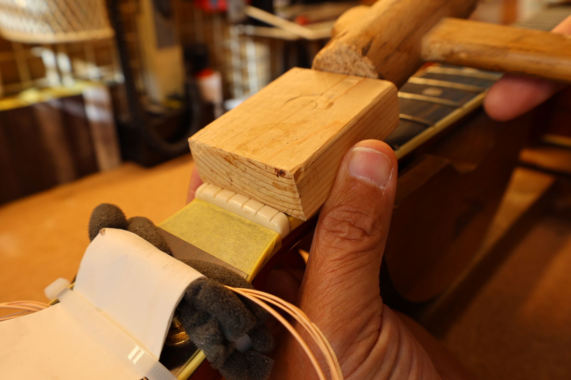 - 42.クランプと当て木でネックを固定し、あふれ出た接着剤をふき取っていきます。