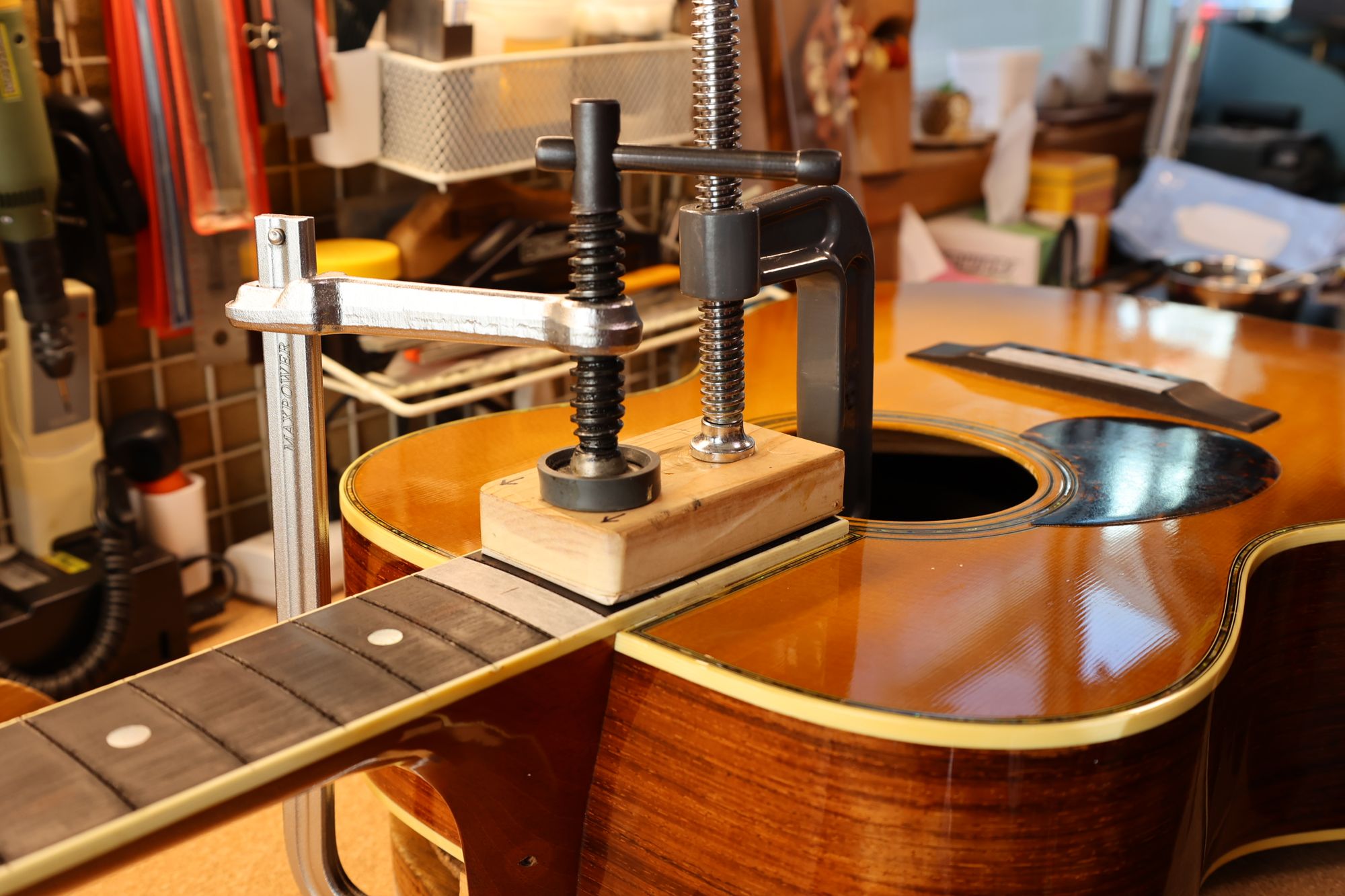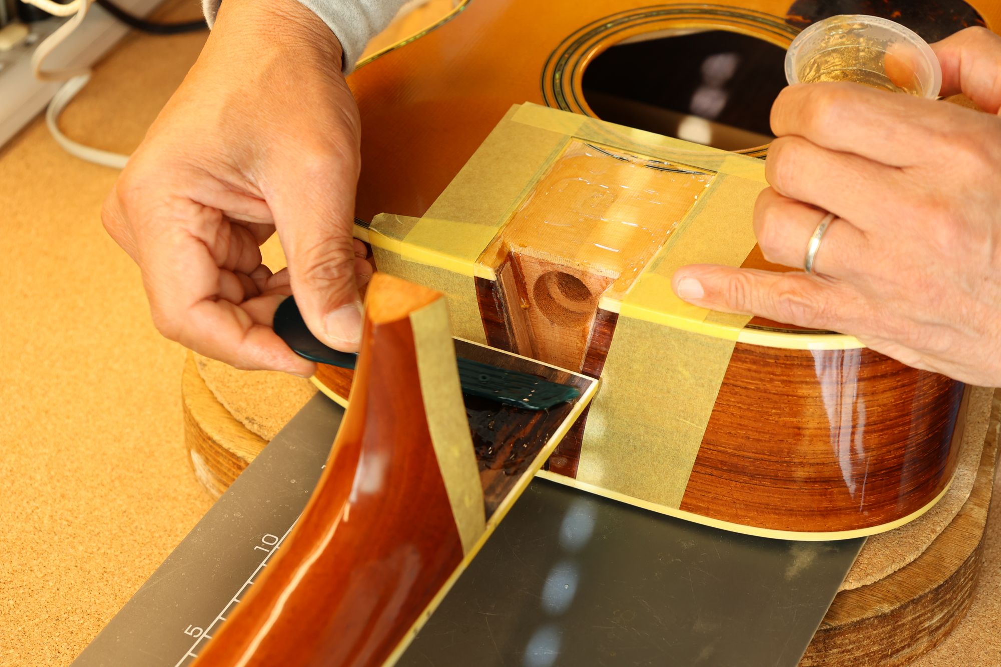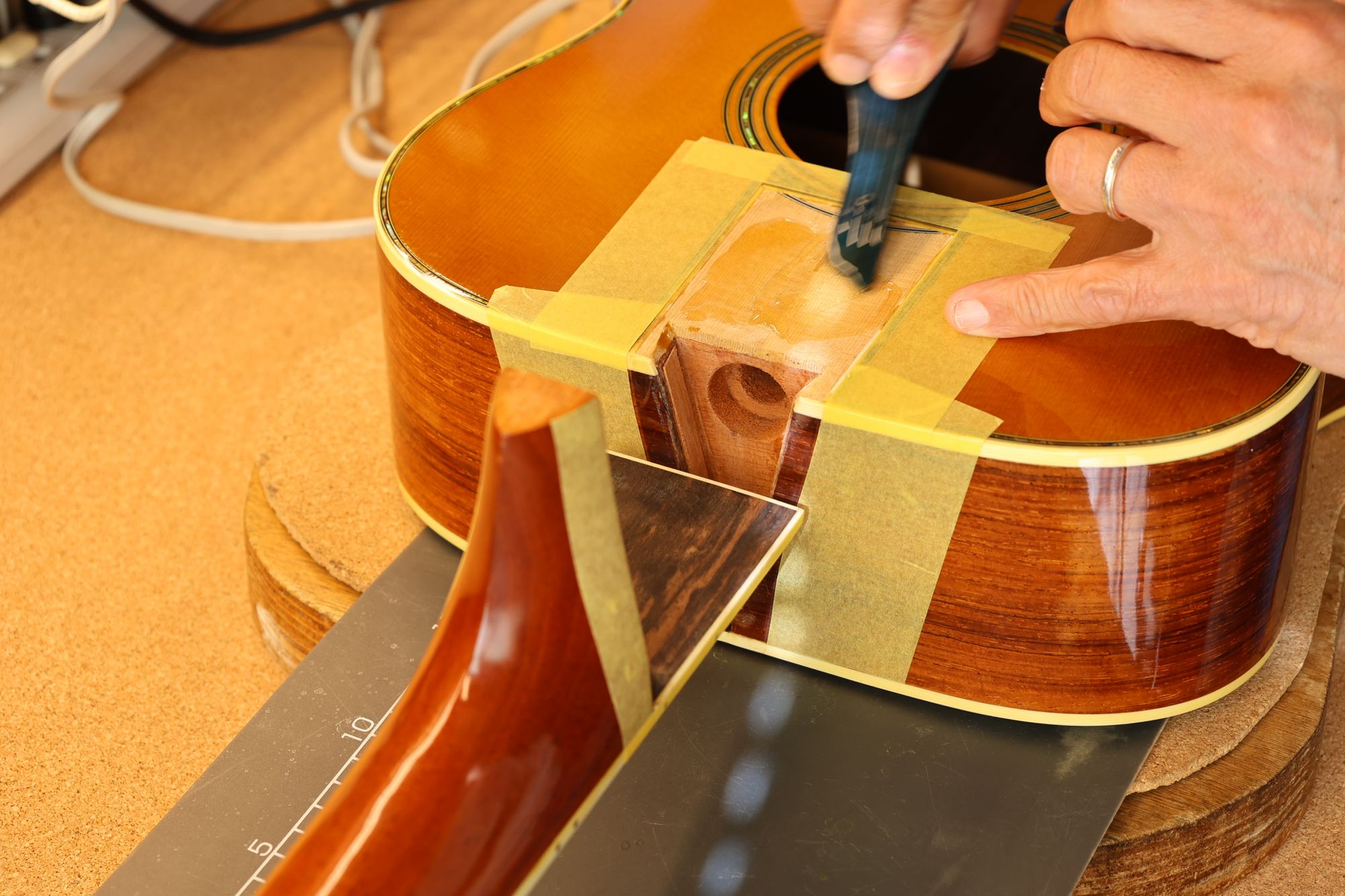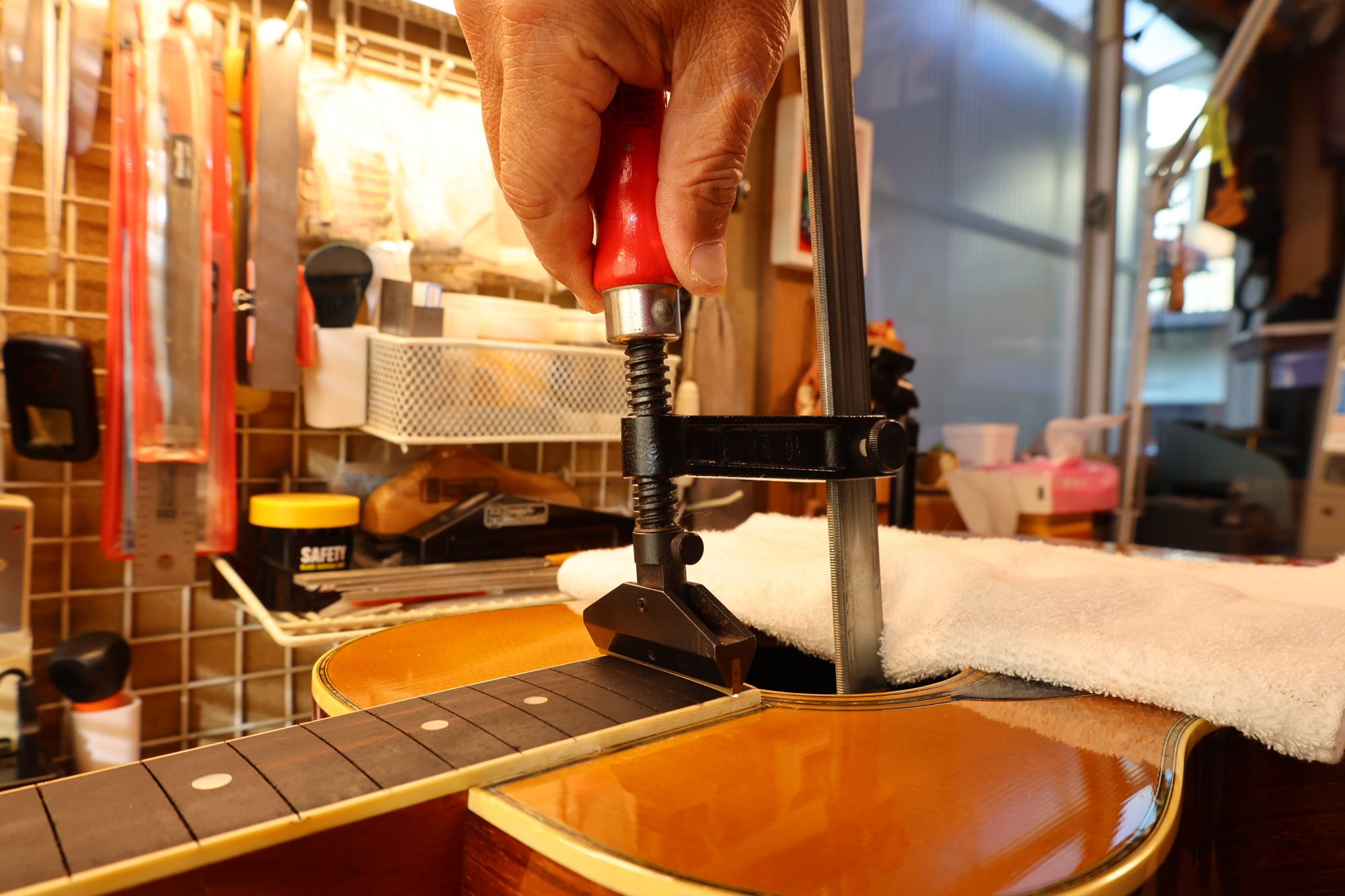- 42.クランプと当て木でネックを固定し、あふれ出た接着剤をふき取っていきます。