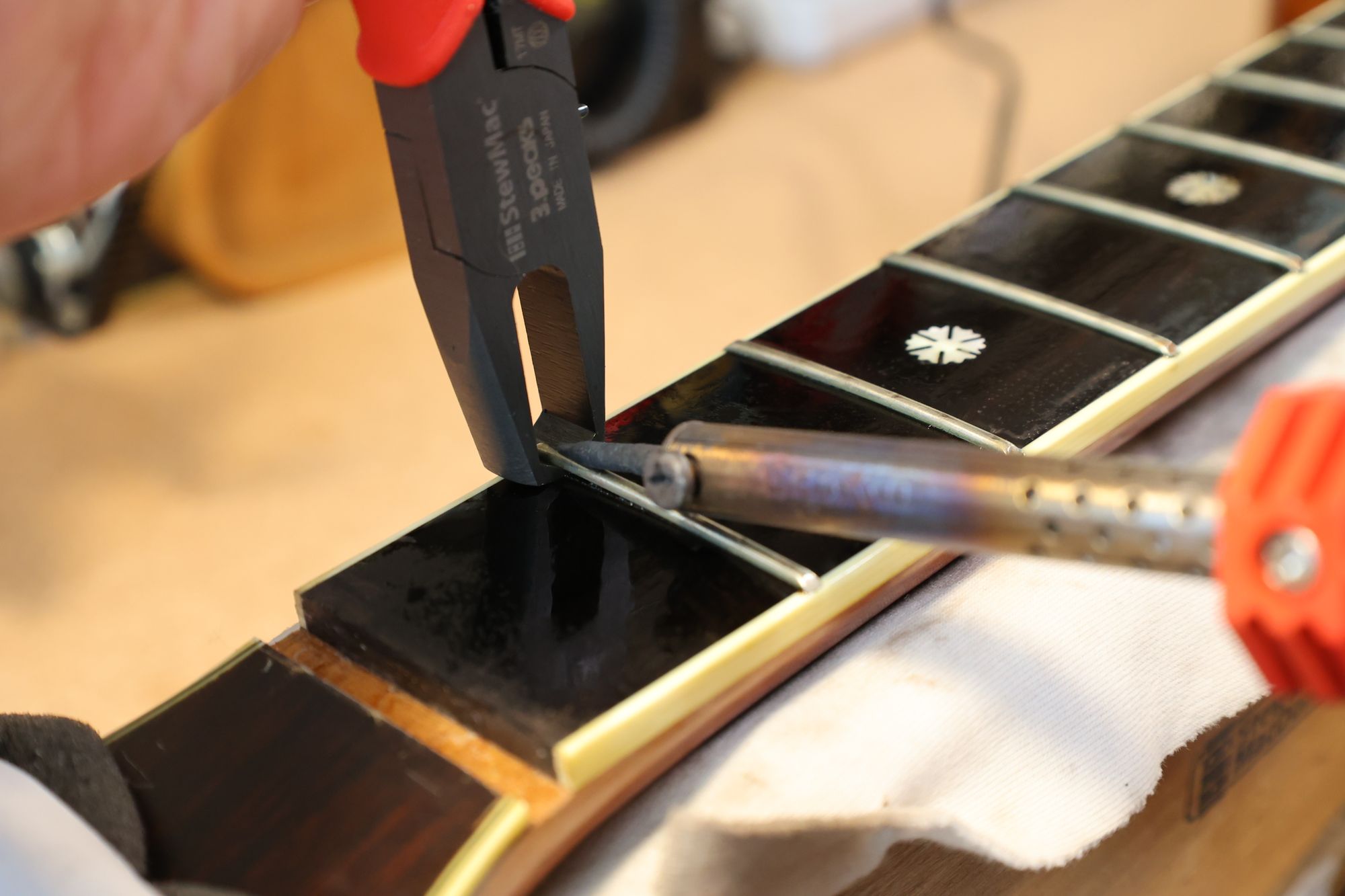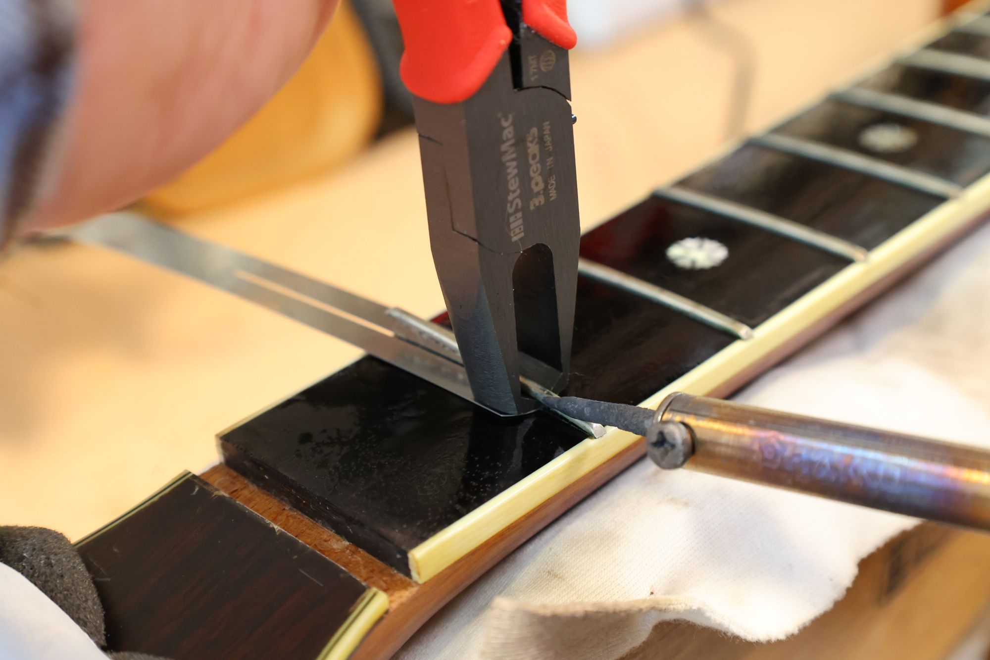 - 2.フレット溝を傷つけないようにハンダゴテで暖めながらゆっくりと抜いていきます。