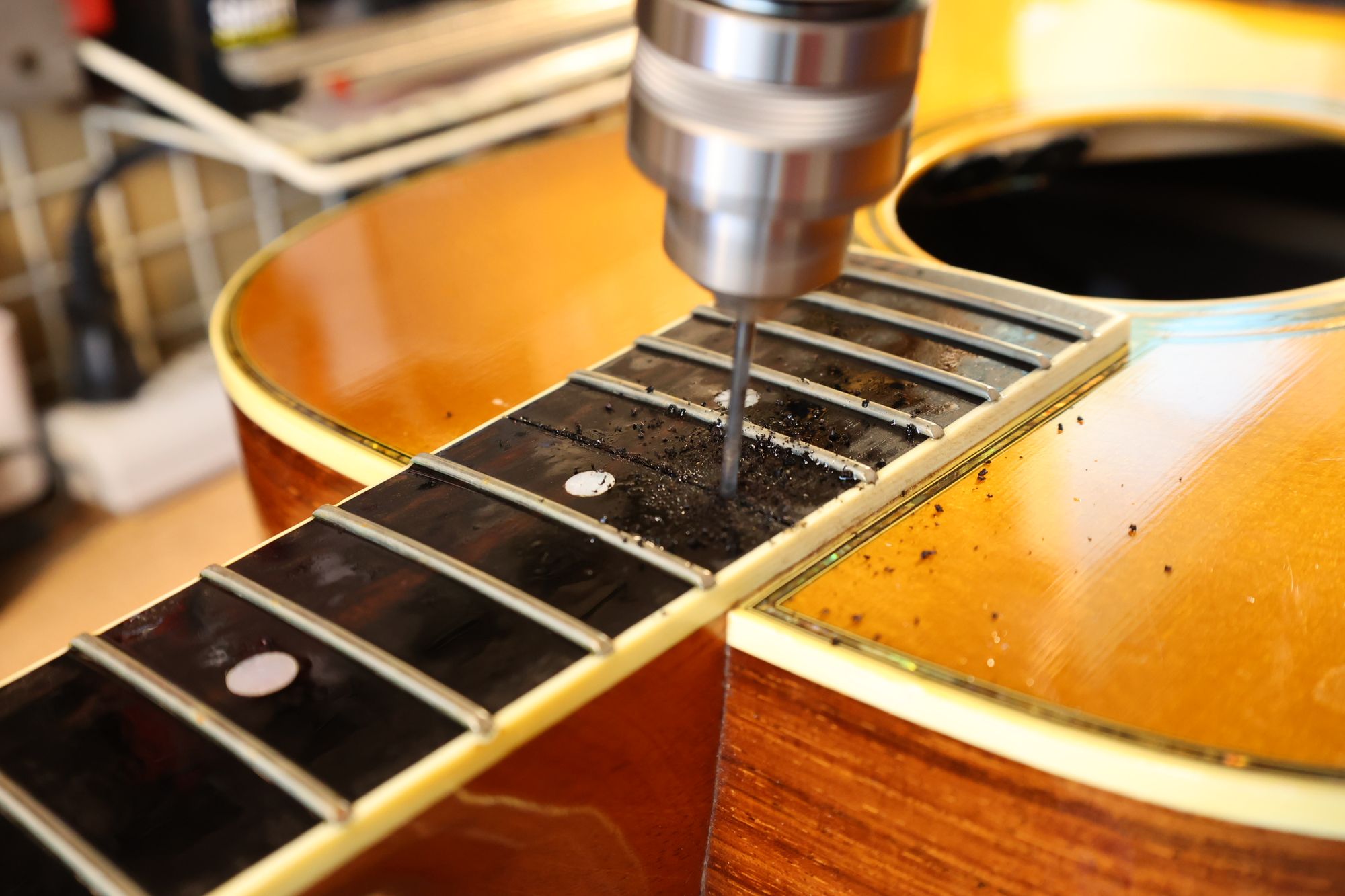 - 3.15フレット溝の奥にあるネックポケット(ネックとボディの接合スペース)にドリルで貫通穴を開けます。