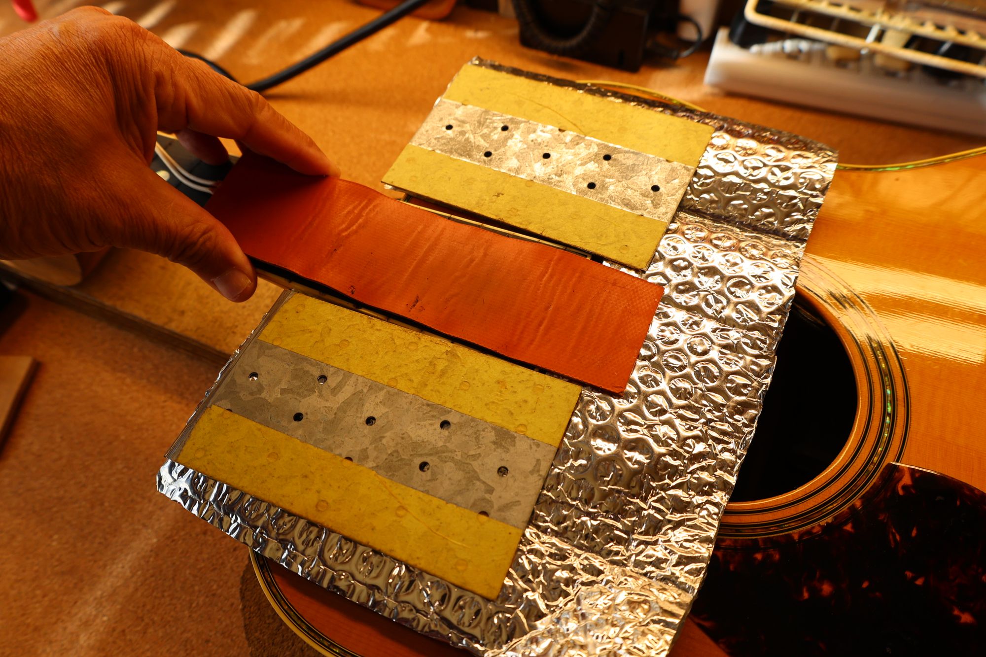 - 1.ボディ内部ブリッジの裏側に取り付けられているブリッジプレートです。弦のエンドポールが食い込んでしまう状態になっています。