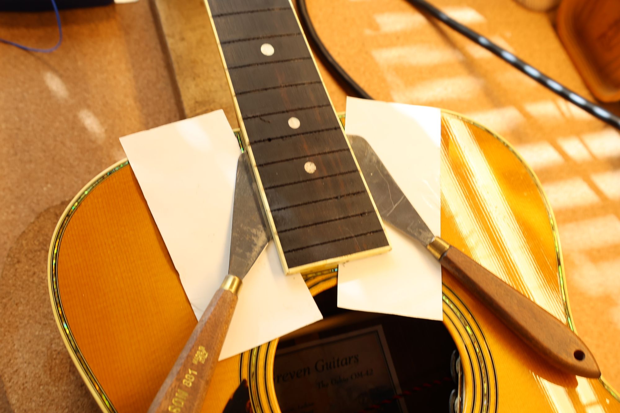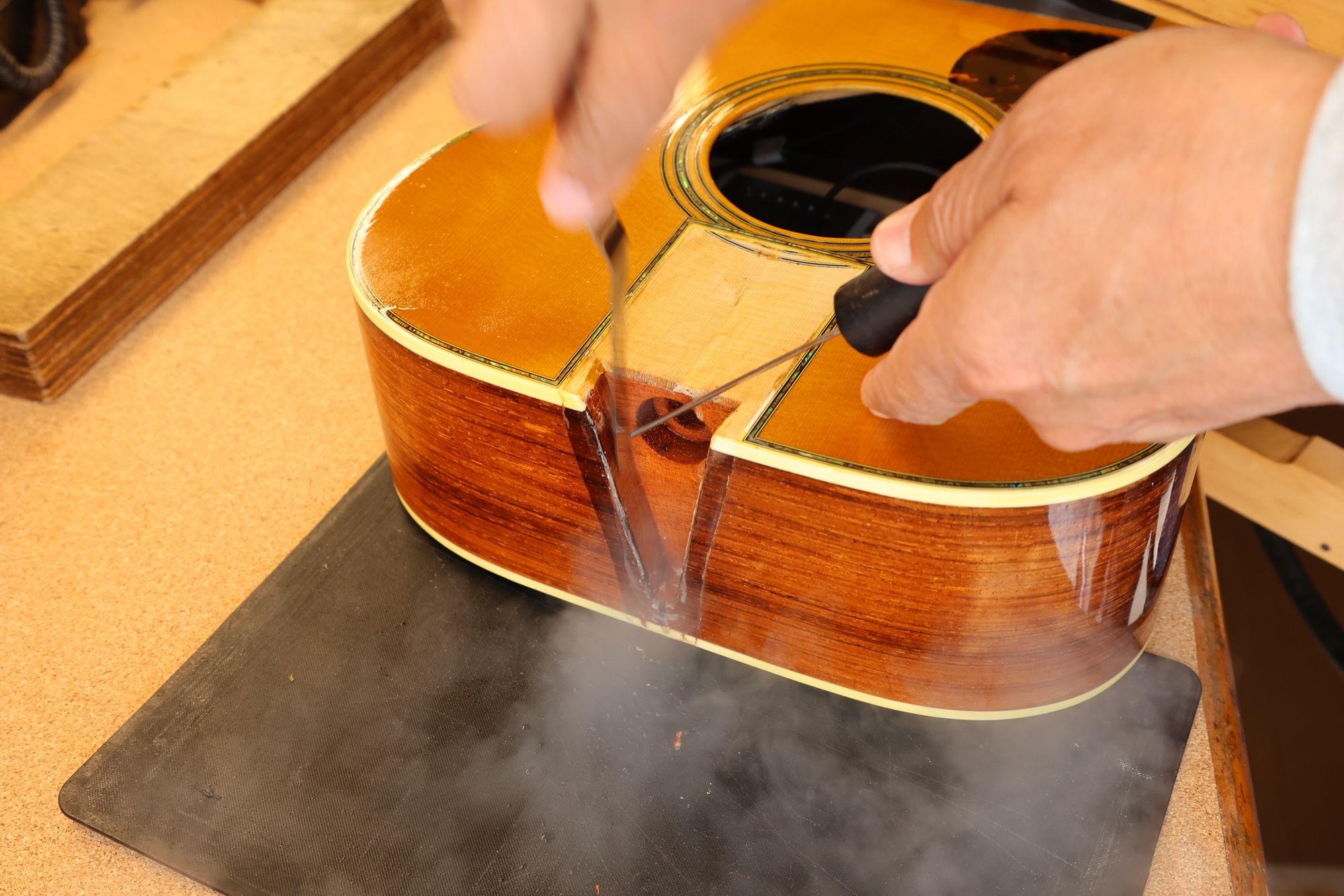 - 8.15フレット下部分までナイフが入りました。フィンガーボードとボディの取り外しが完了です。次にネックの取り外しを行いましょう。