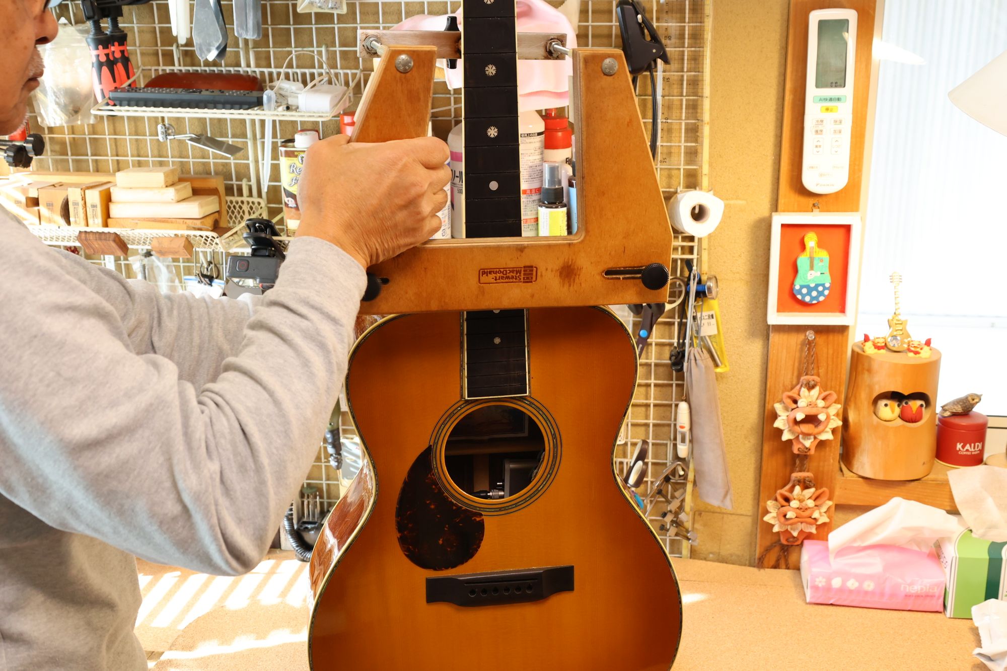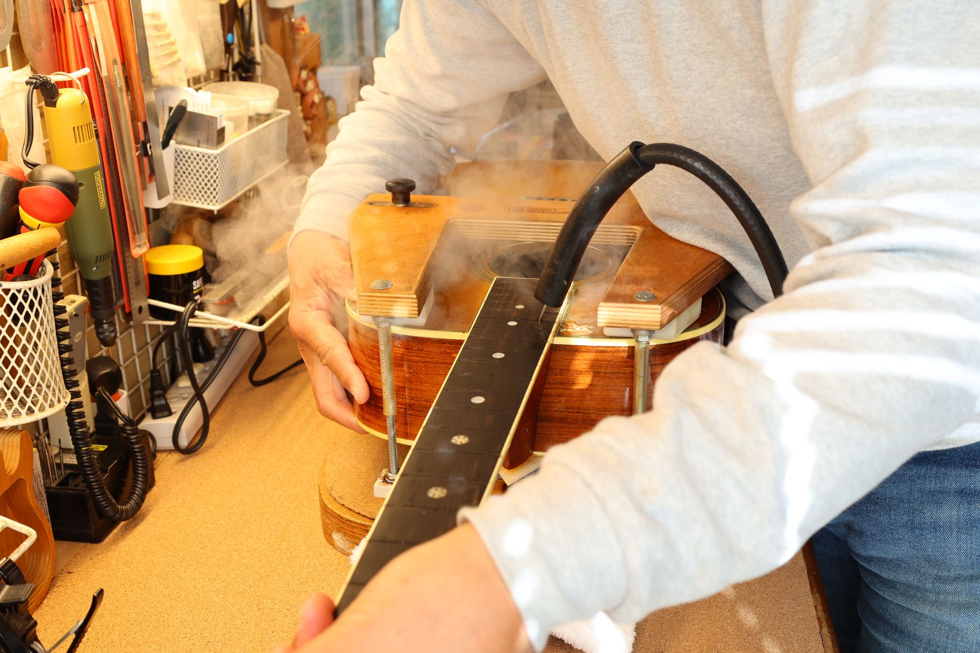 - 9.ネックは蒸気ではずします。まず専用のジグを取り付けます。