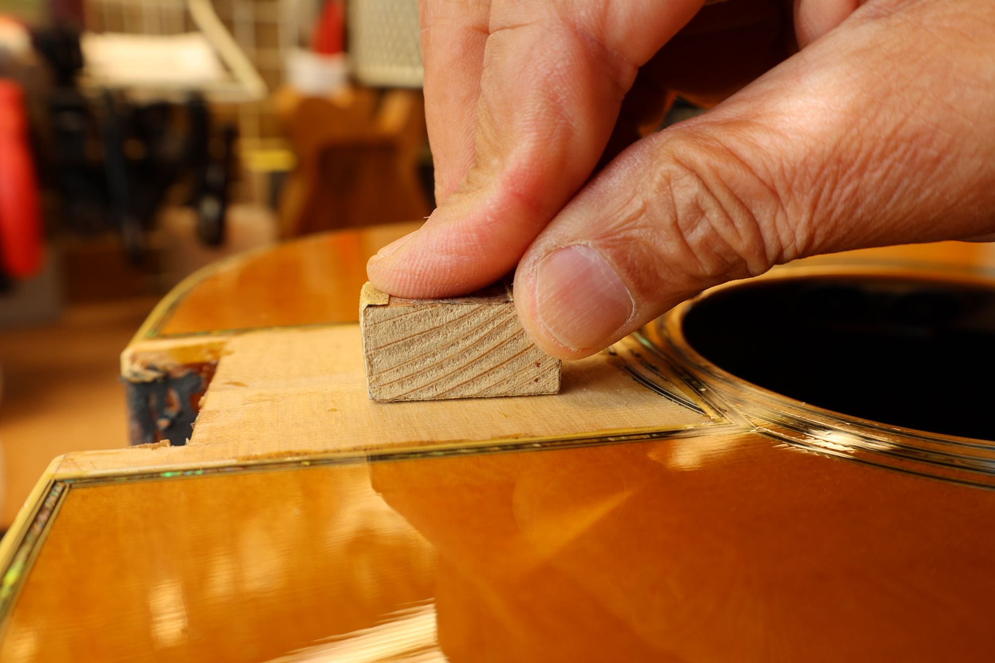 - 27.ボディとフィンガーボード接合部をサンディングブロックで平坦にしておきます。