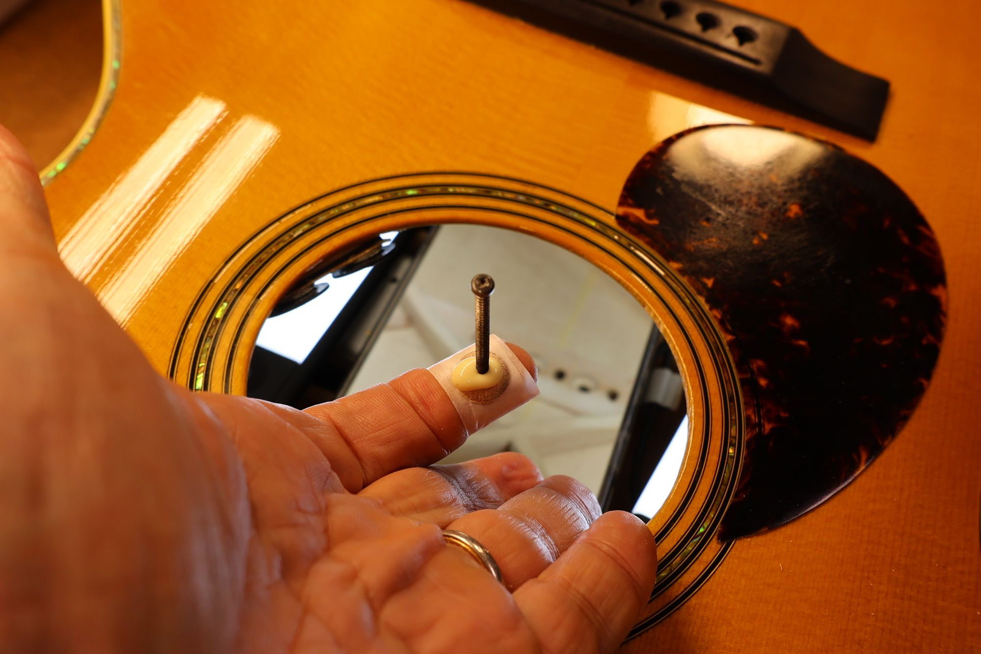 - 19.1,3,5弦のプラグ固着後、同じように2,4,6弦のプラグ接着を行います。