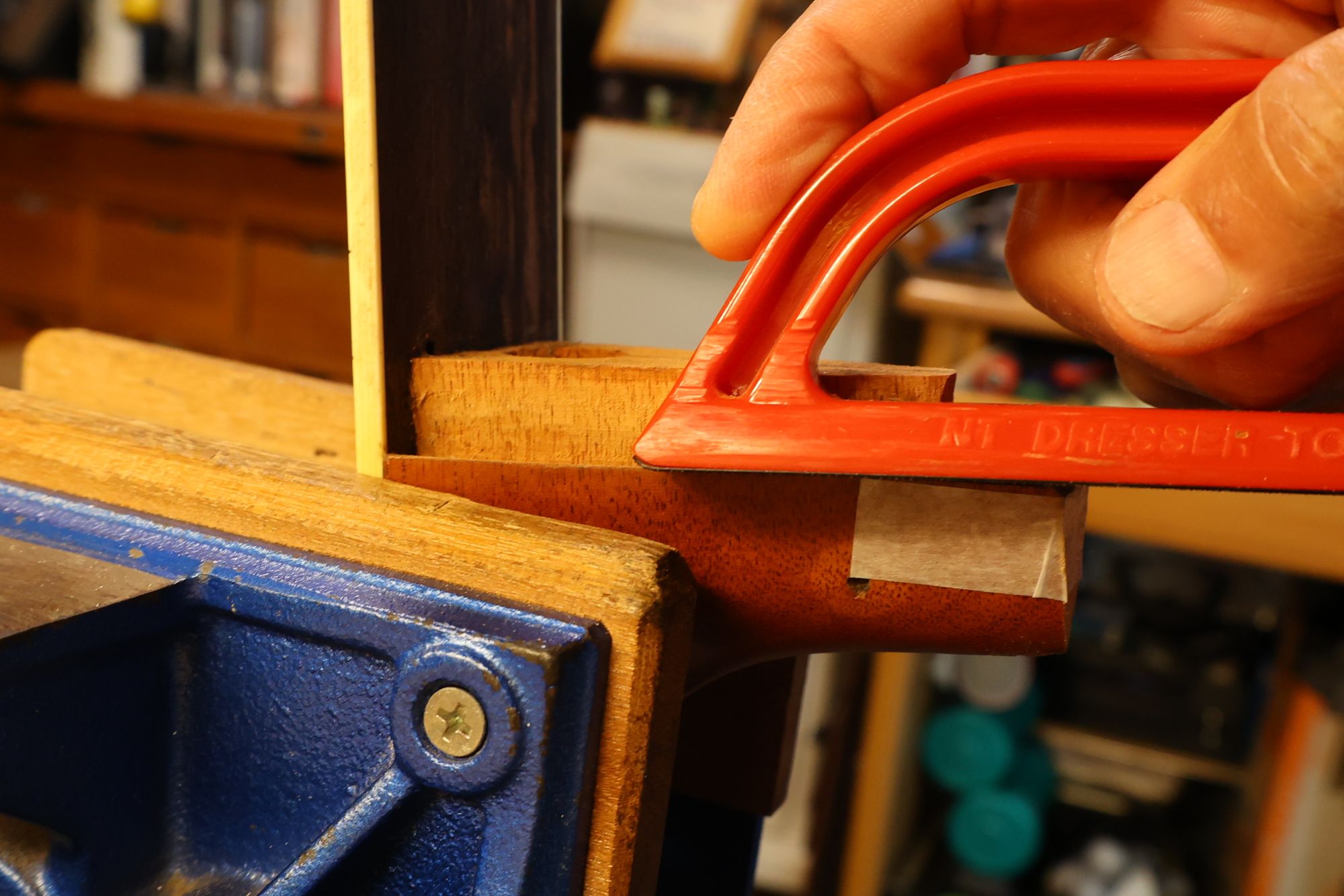 - 21.ネックヒール部です。マスキングテープを貼り、この部分の微妙な高さを目安に作業を進めていきます。