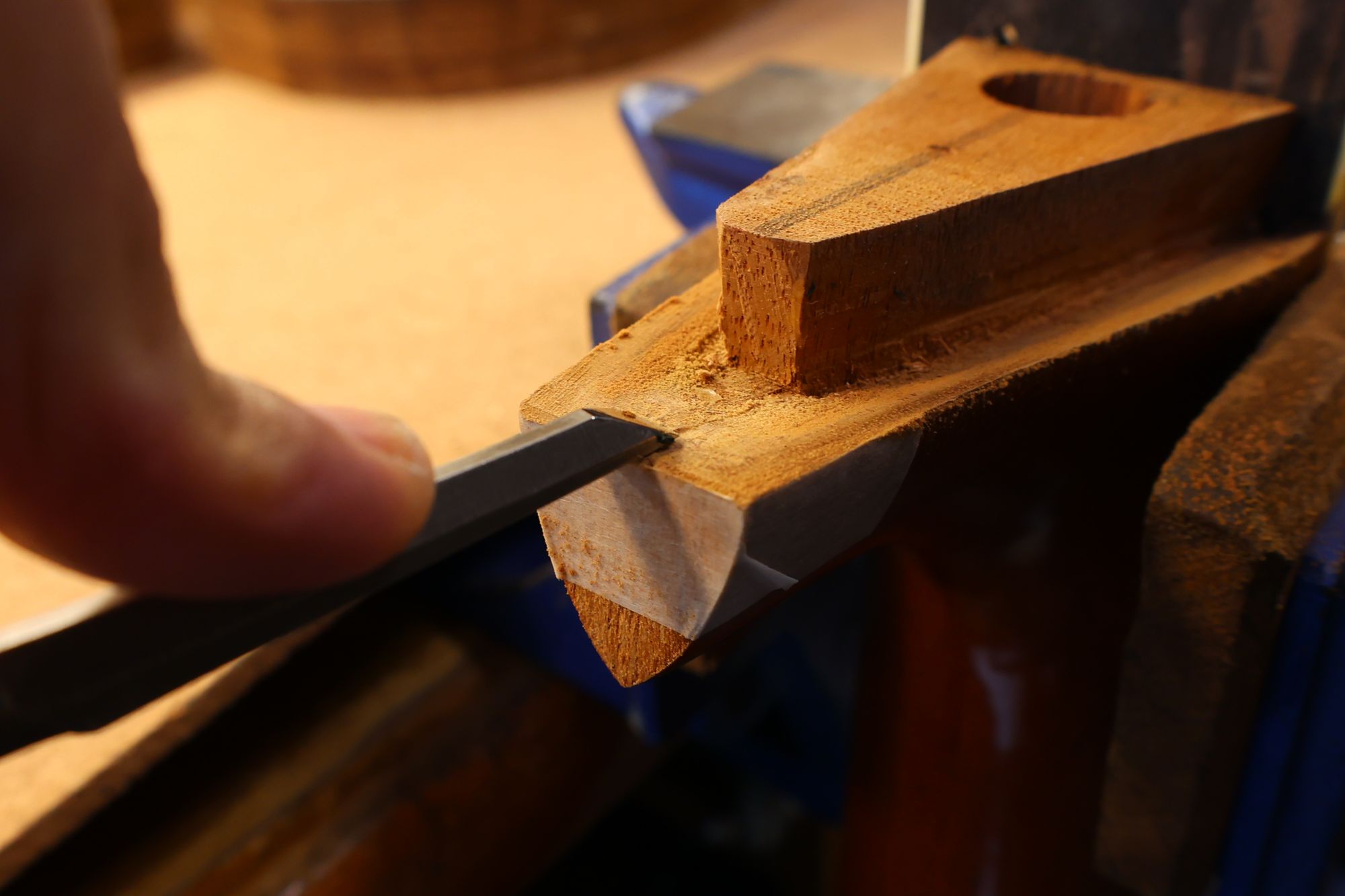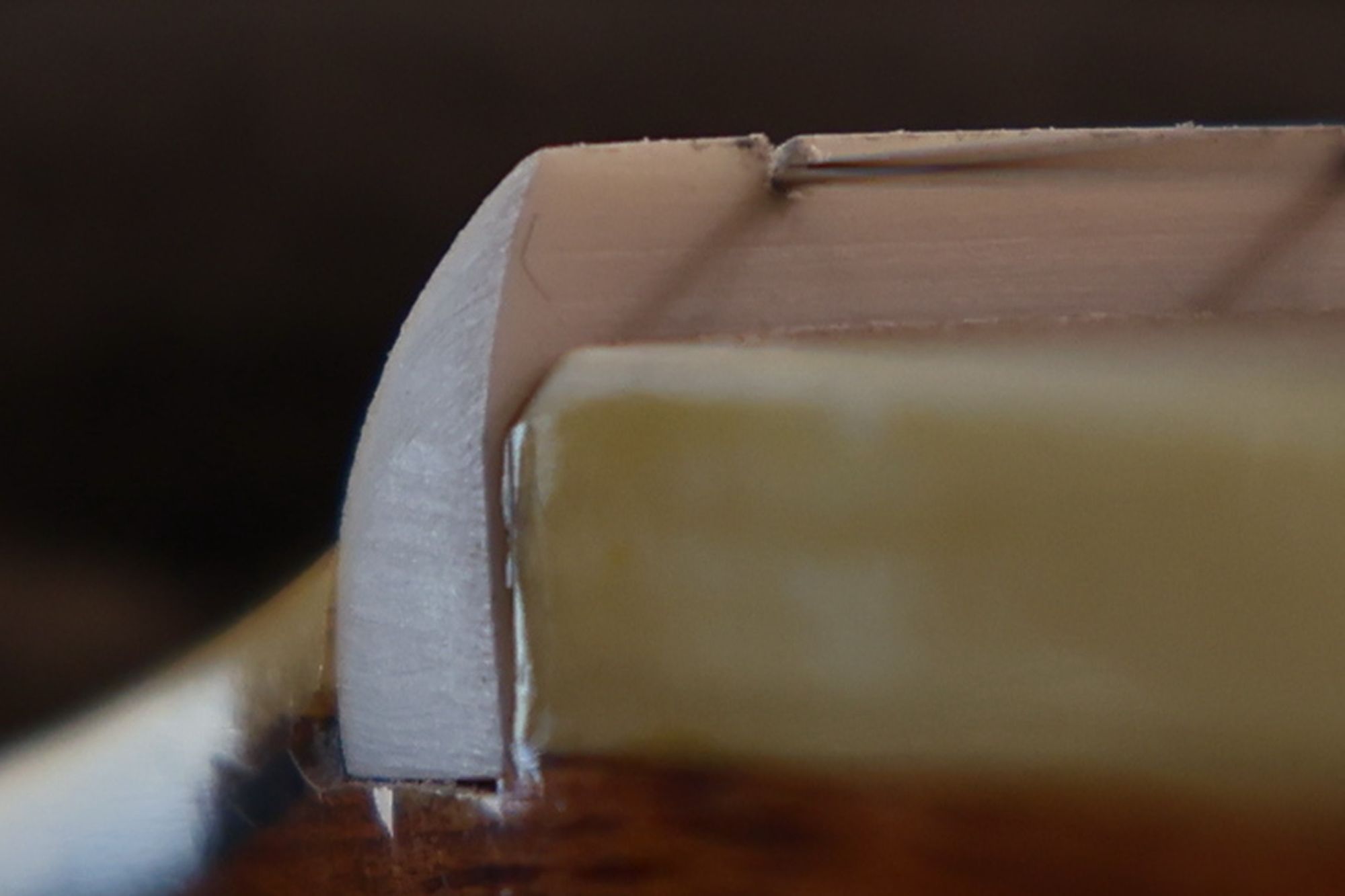 - 24.ネック接合部を削っていきます。フィンガーボード側(右)は削らず、ヒール部(左)だけに傾斜を持たせるように加工していきます。