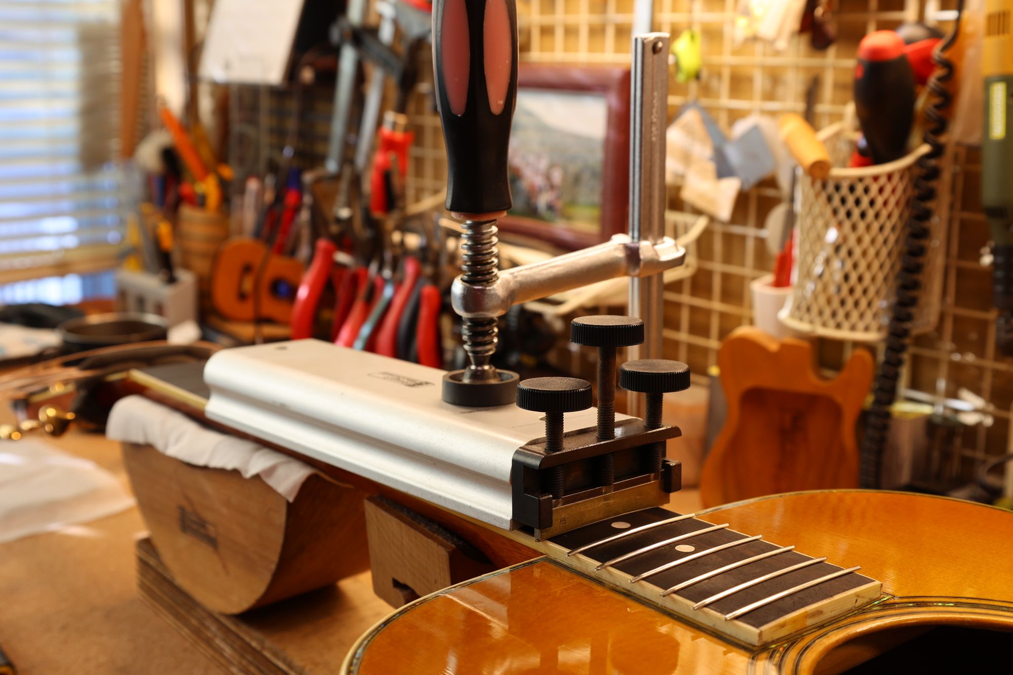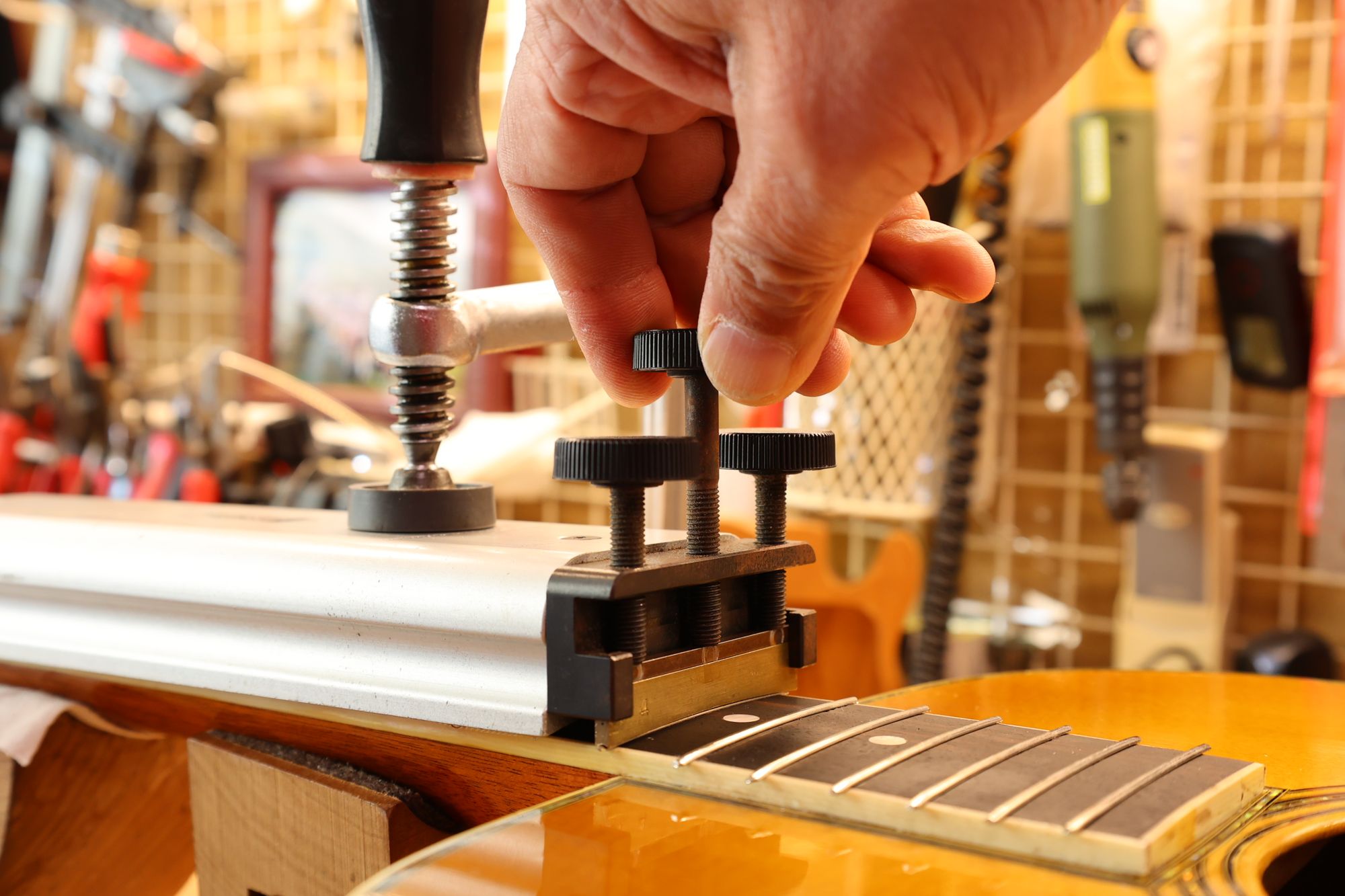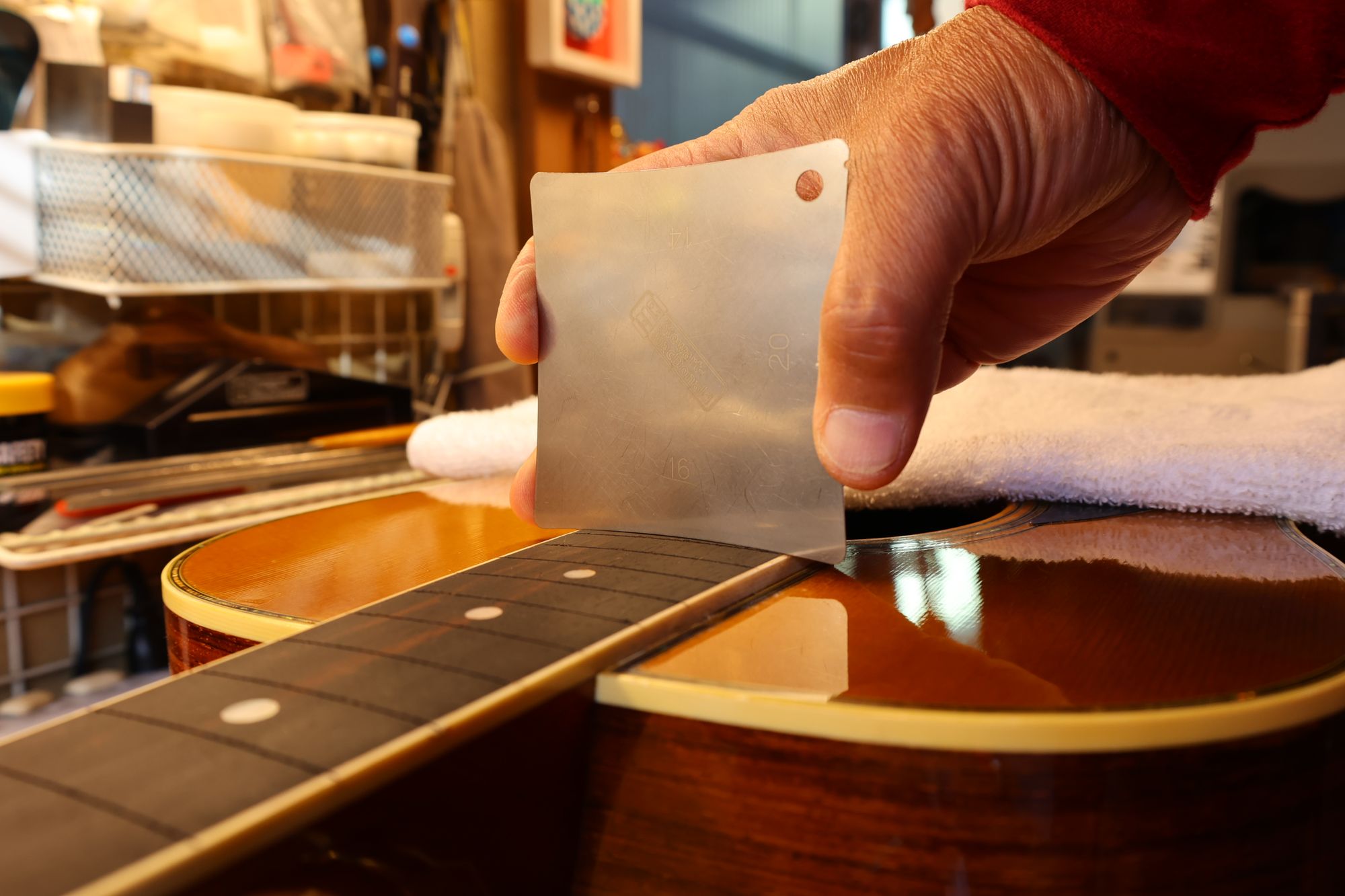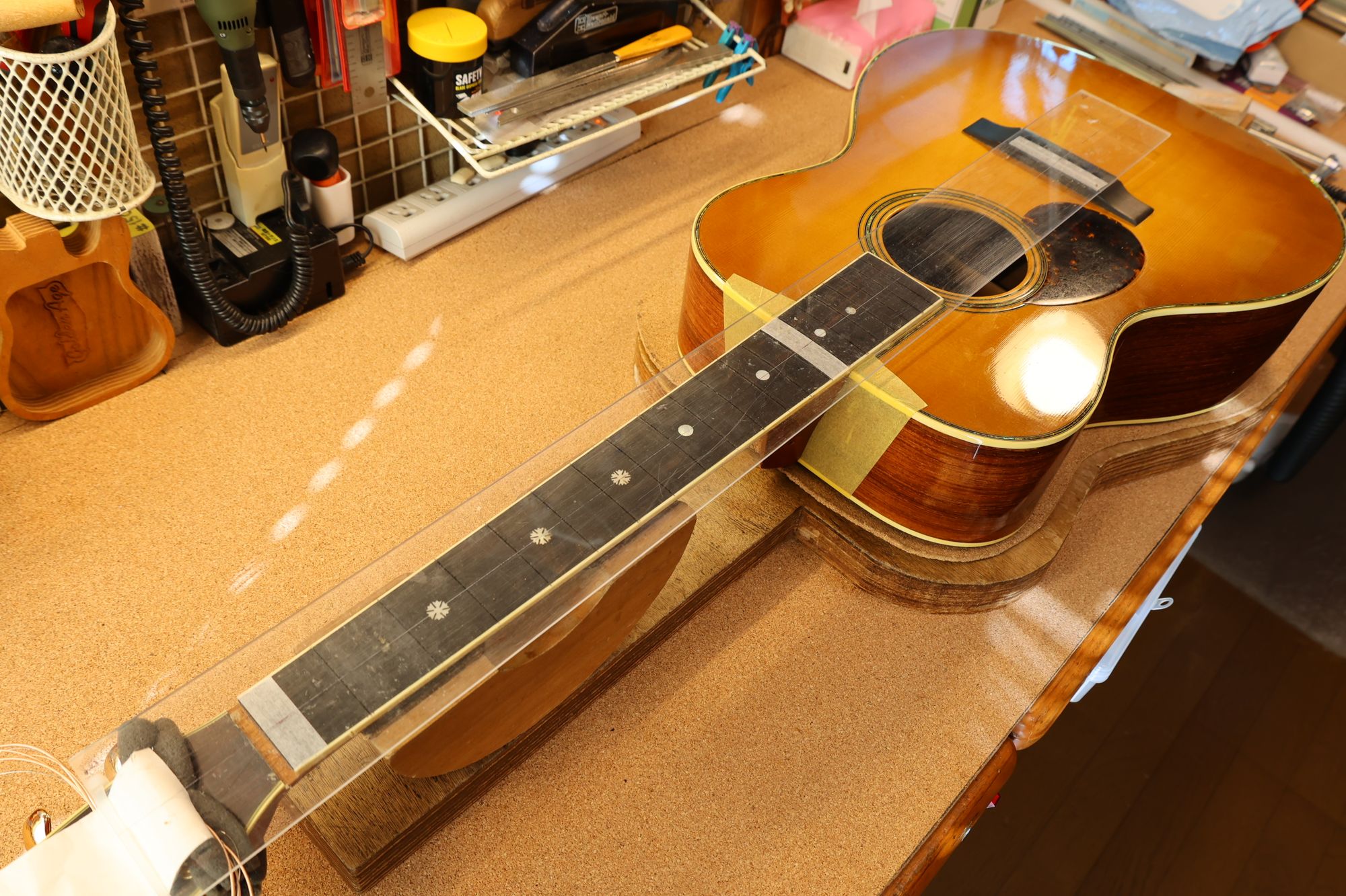 - ネックとボディの直線性と取り付け角度を確認している様子です。