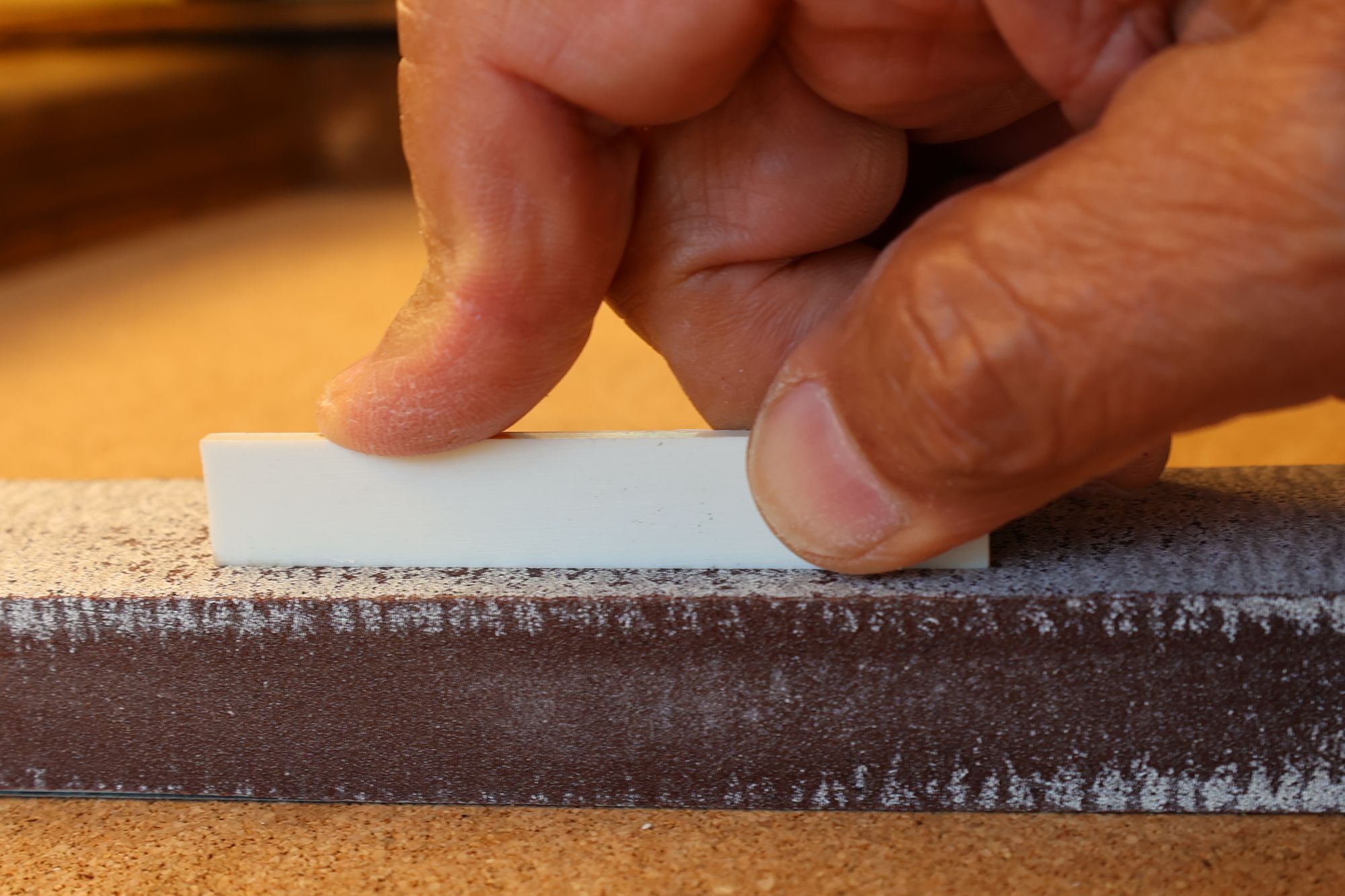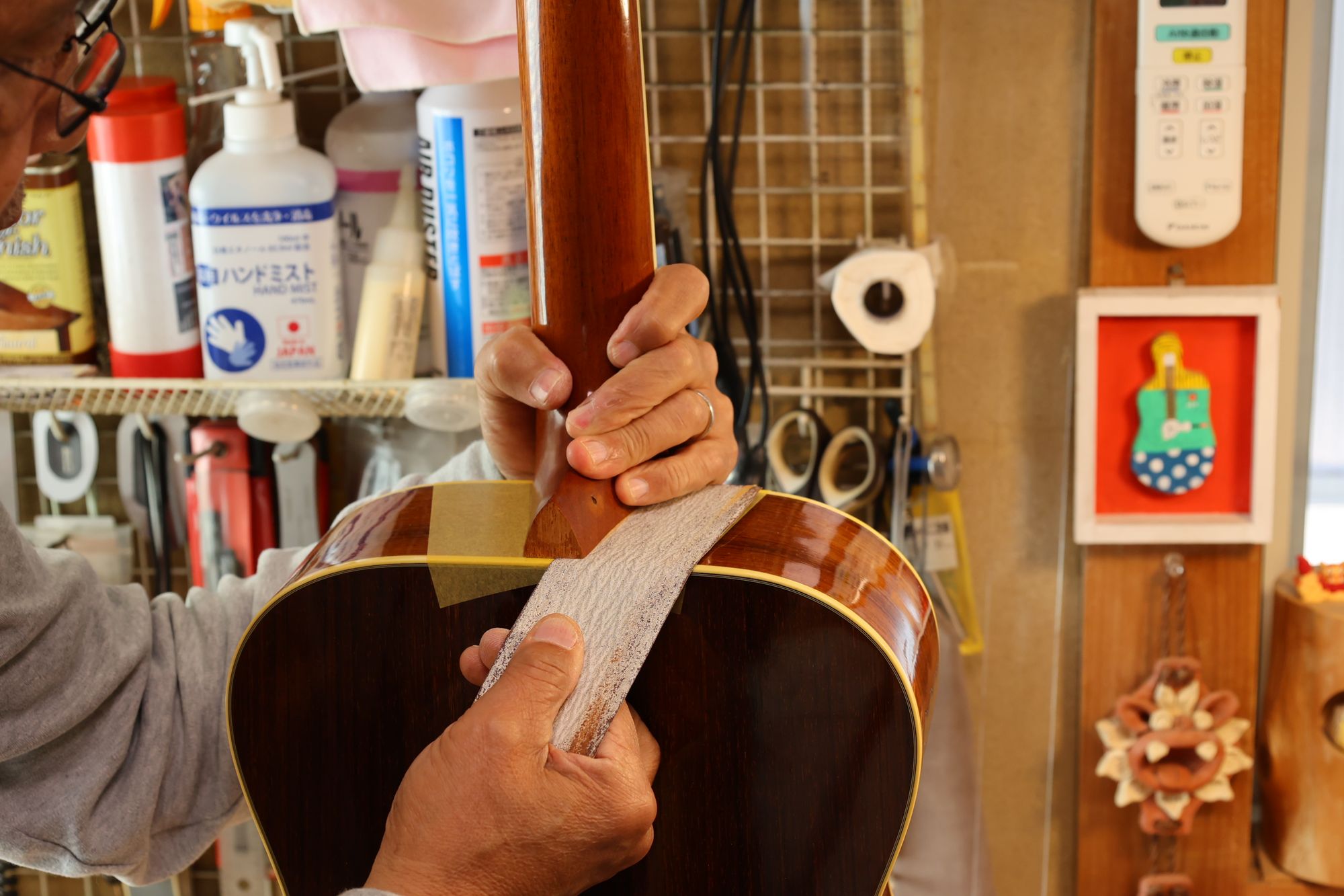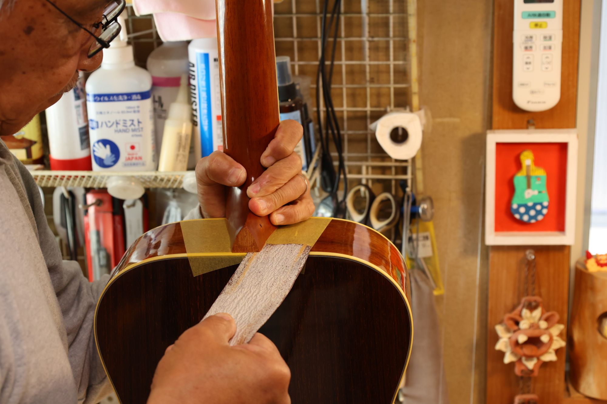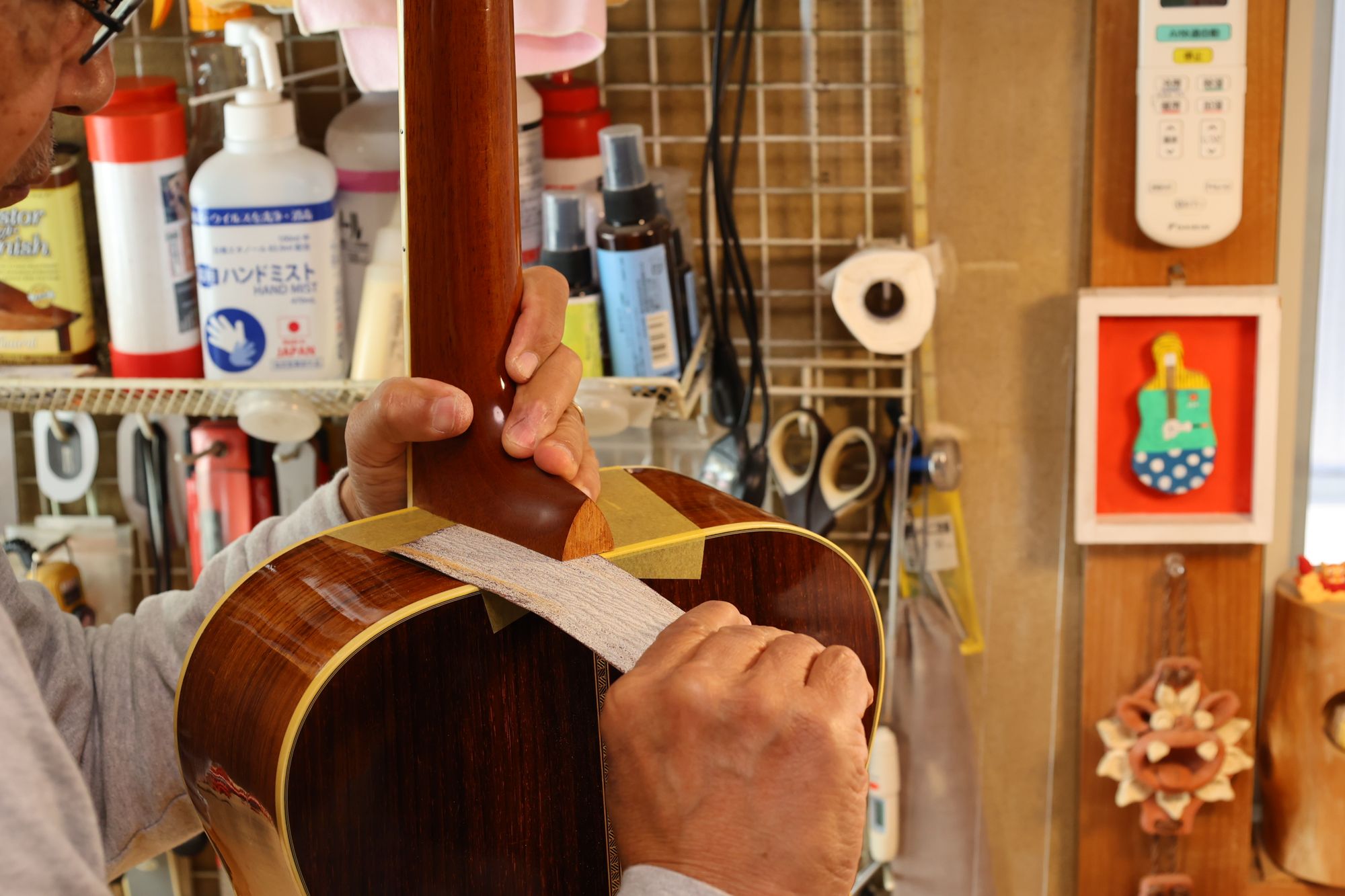 - 29.ネックとボディの間にサンドペーパーを挟みます。