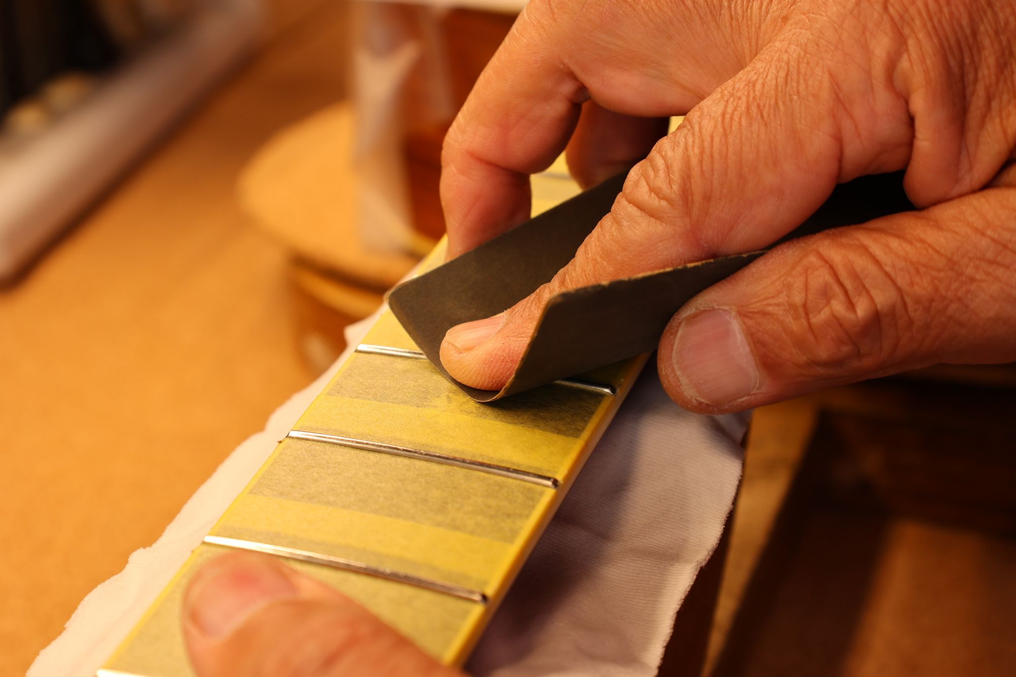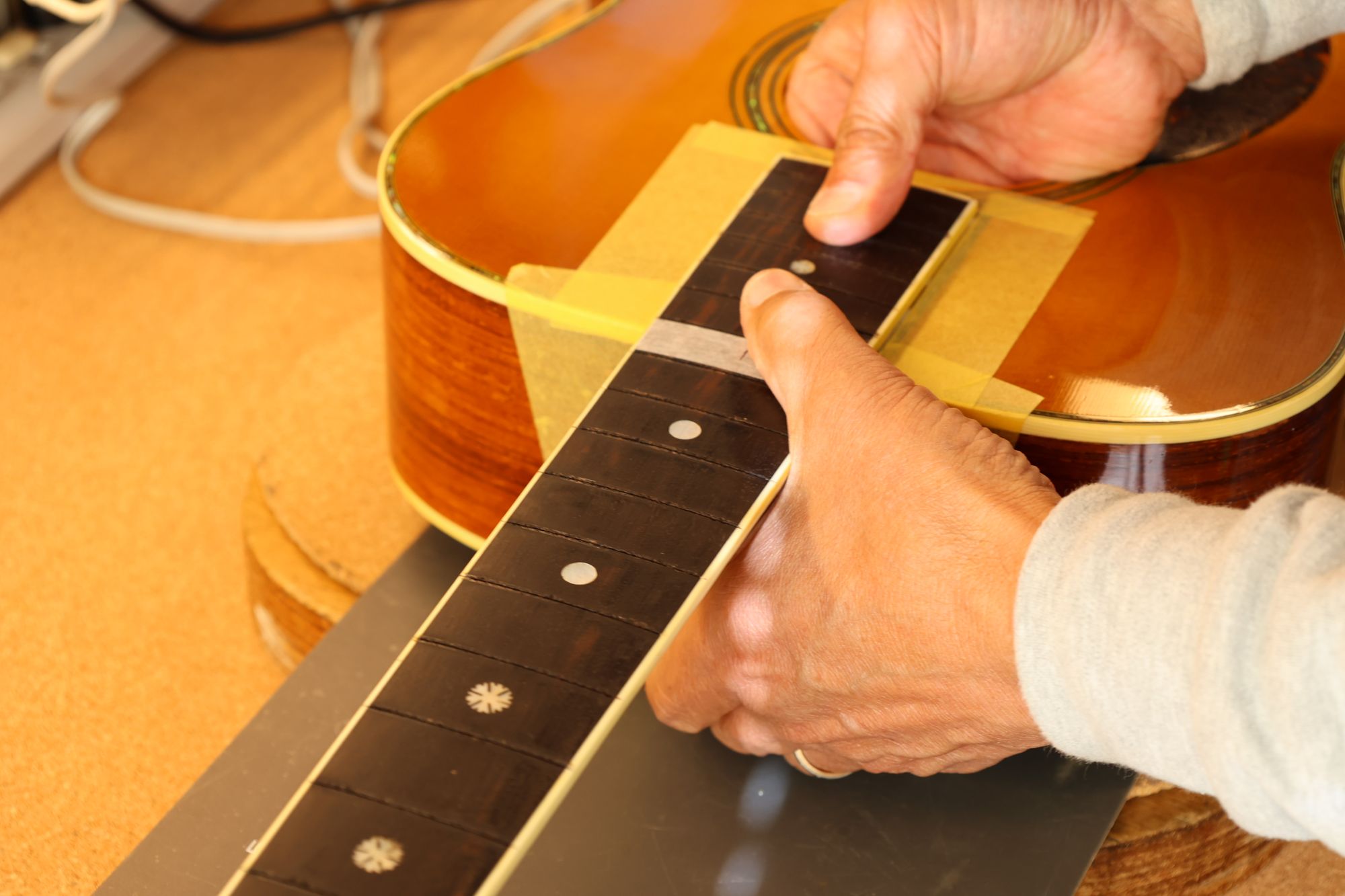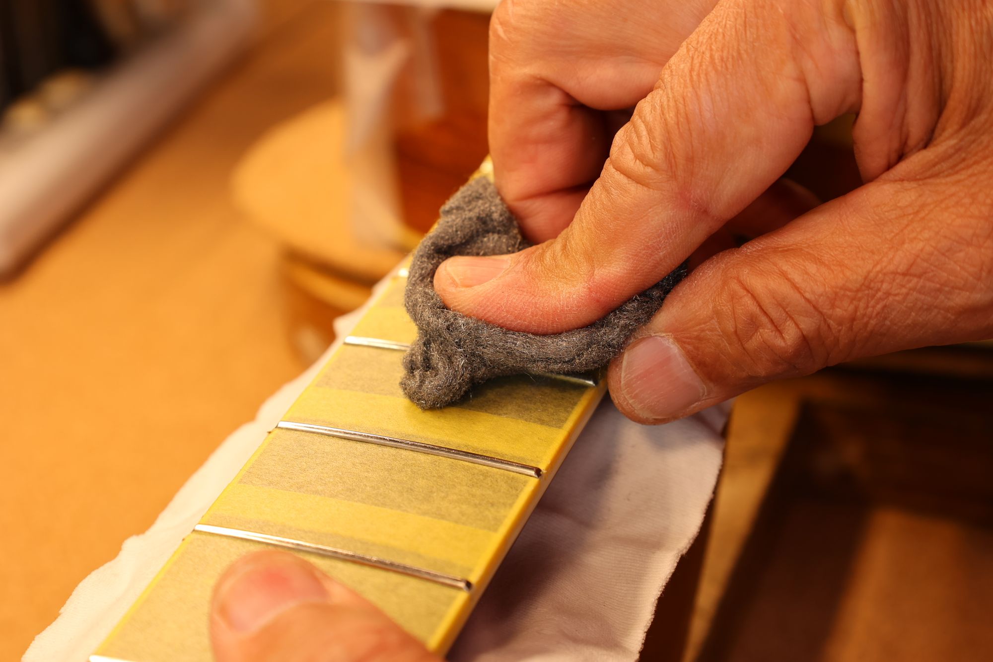 - 35.引き続いてフレットすりあわせを行いましょう。マスキングテープでフィンガーボードを保護します。
