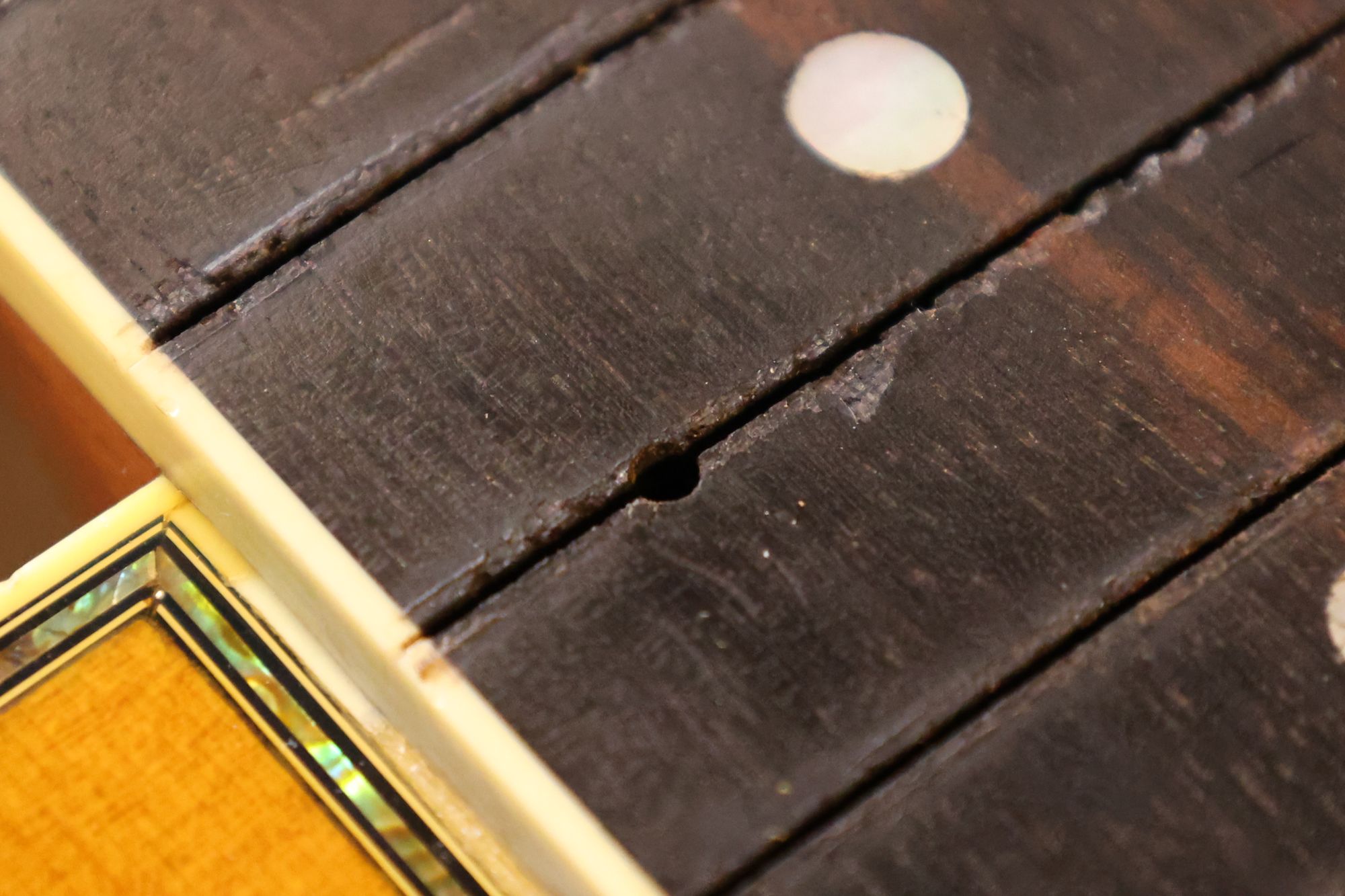 - 6.穴埋め加工が終わった15フレット溝です。